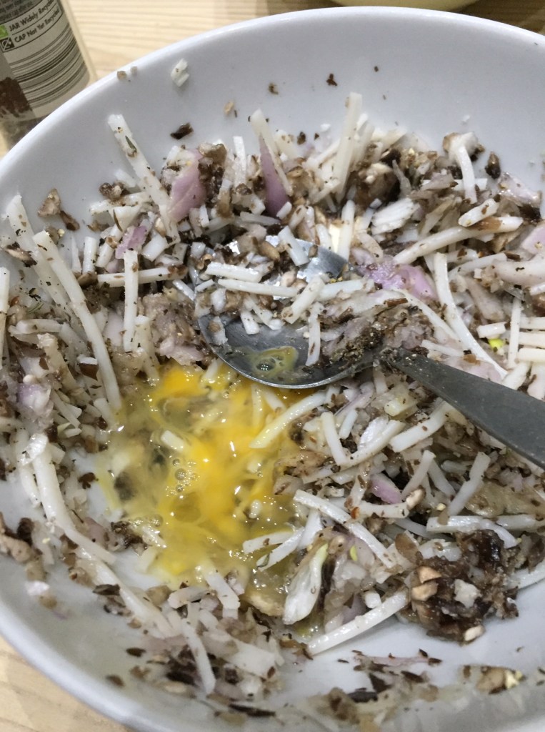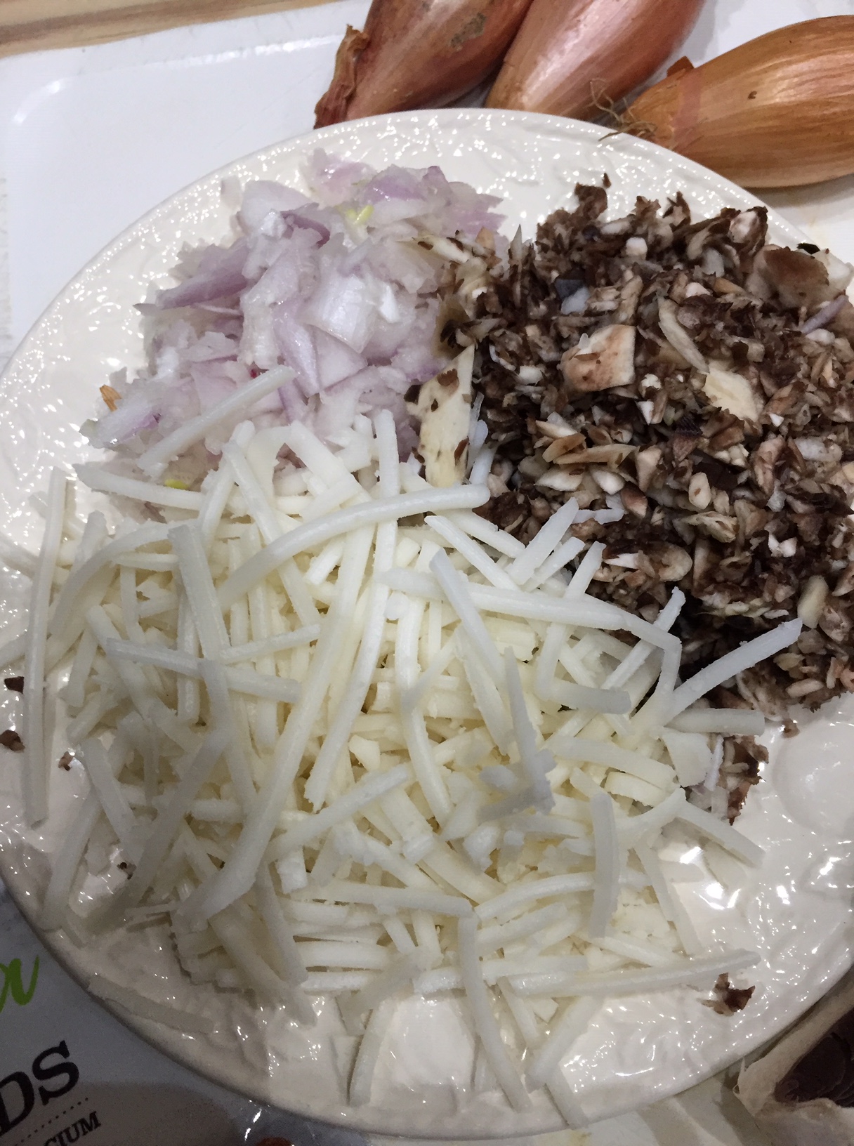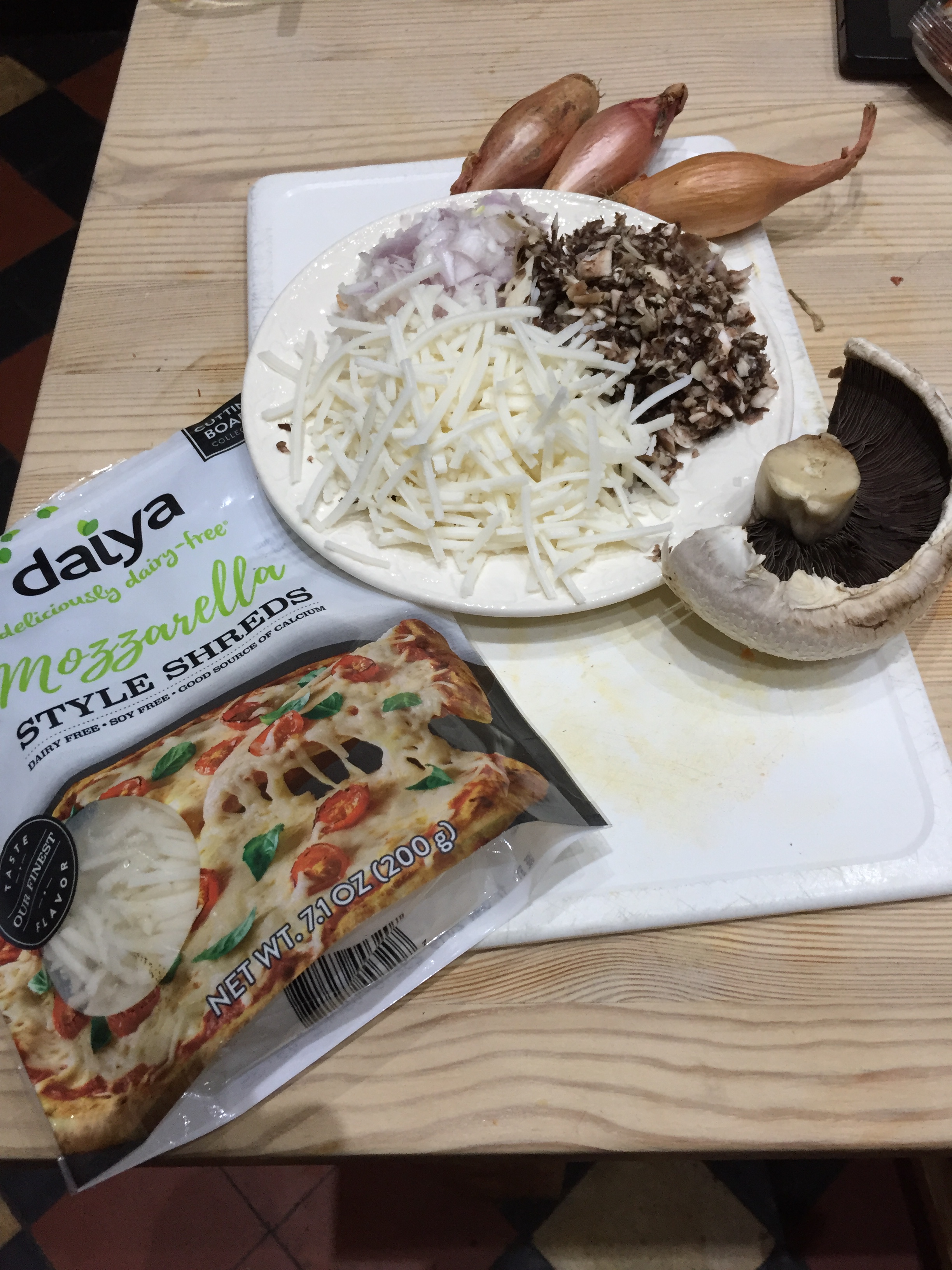 - Half a cup of each of grated vegan cheese, shallots and mushrooms.