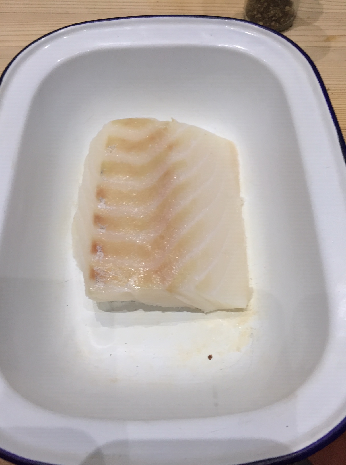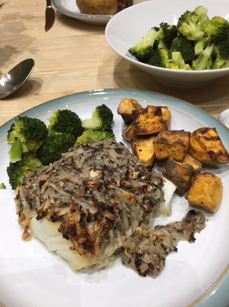 I love fish and it agrees with my stomach. Gluten-free fish and chips can be good but as my stomach has been disordered, I thought I would go with a thick fillet of cod. The topping is made up of vegan cheese, grated shallots and finely chopped mushrooms. Instead of grating or chopping I used an electric mini-chopper.