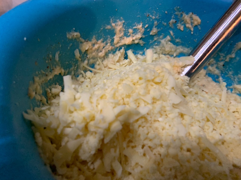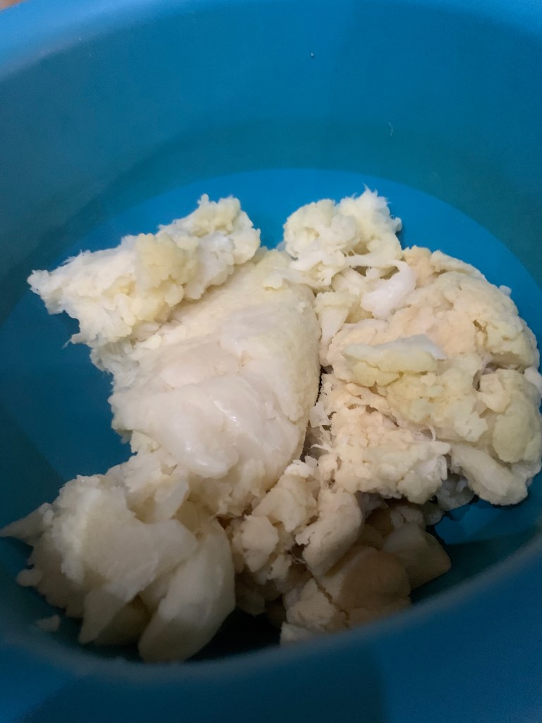 This time, I added an extra step of placing the steamed/boiled cauliflower into a clean tea towel and squeezing excess water out. This made a great difference to the consistency of the baked cauliflower mash.
