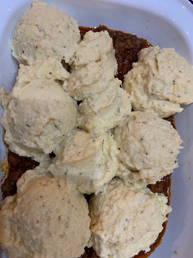 Gently spoon the cauliflower mash onto the beef mixture in your casserole dish. I use an ice-cream scoop as it’s quicker and a more even distribution. Roughing the surface gives a crisper surface.