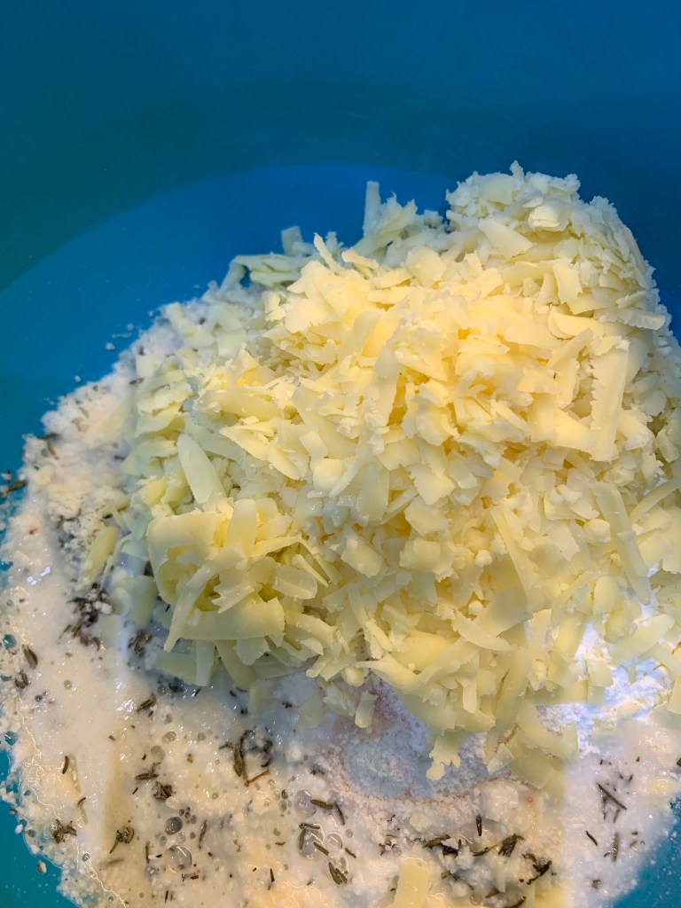 - Mix together all the dry ingredients: sweetener, almond flour, coconut flour, salt, garlic powder, baking powder, xanthan gum and thyme. Then add the cheddar cheese and milk.