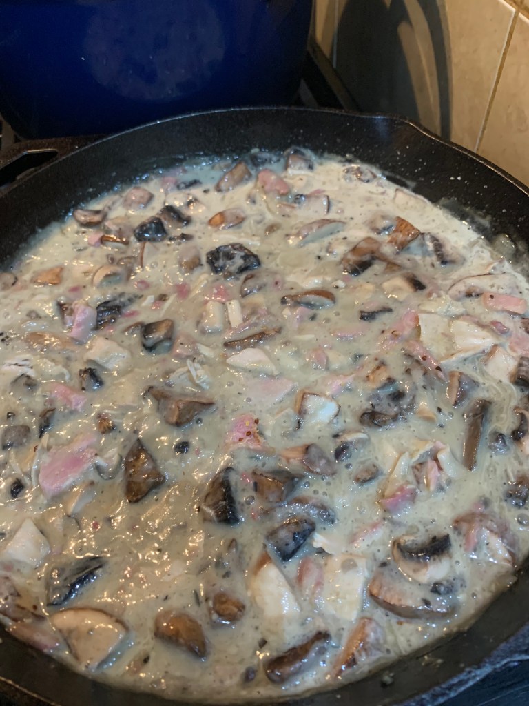 4) Once thickened, take the mixture off the heat and add turkey, gammon, and sliced mushrooms, as well as seasonings. Taste, and adjust the salt and pepper, if needed. I added an additional 1/3 cup of cream at this point, as I felt the sauce was too thick.