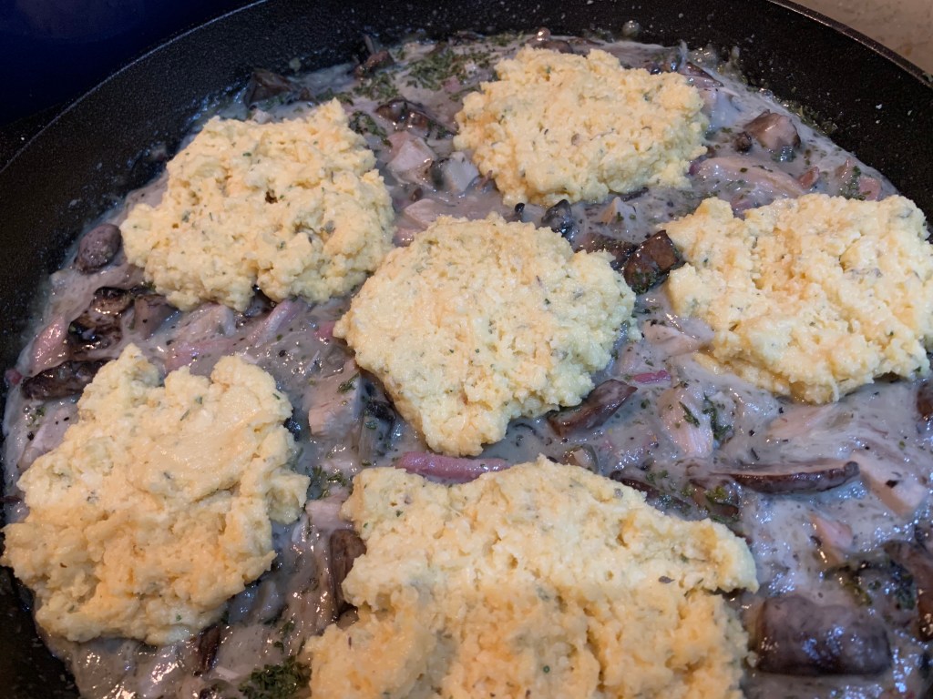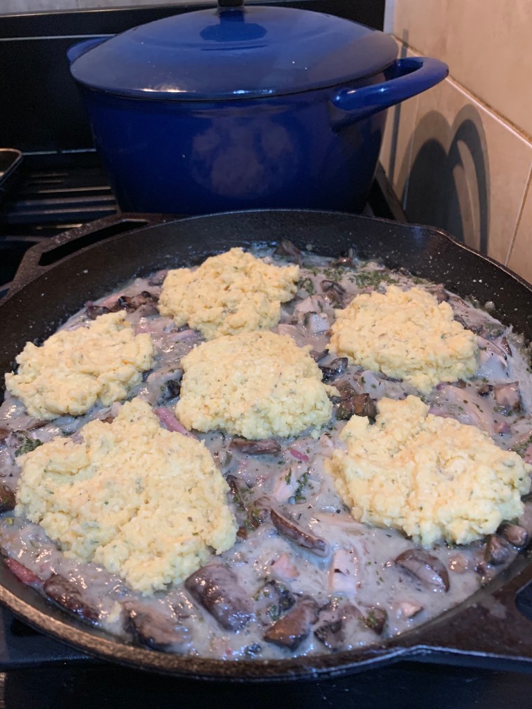3) Add eggs, grated cheese, and parsley to the mixture. Stir until fully incorporated. Freeform 6 large biscuit mounds and drop on top of the turkey mixture.