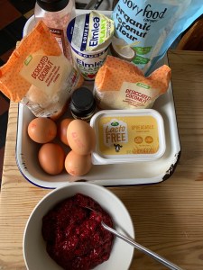 I needed something sweet and this recipe was just right. It has a buttery pastry base, a raspberry chia seed jam filling and a coconut topping. This is a moist jammy delight! Unlike other Keto bars it doesn’t fall apart as you eat it.