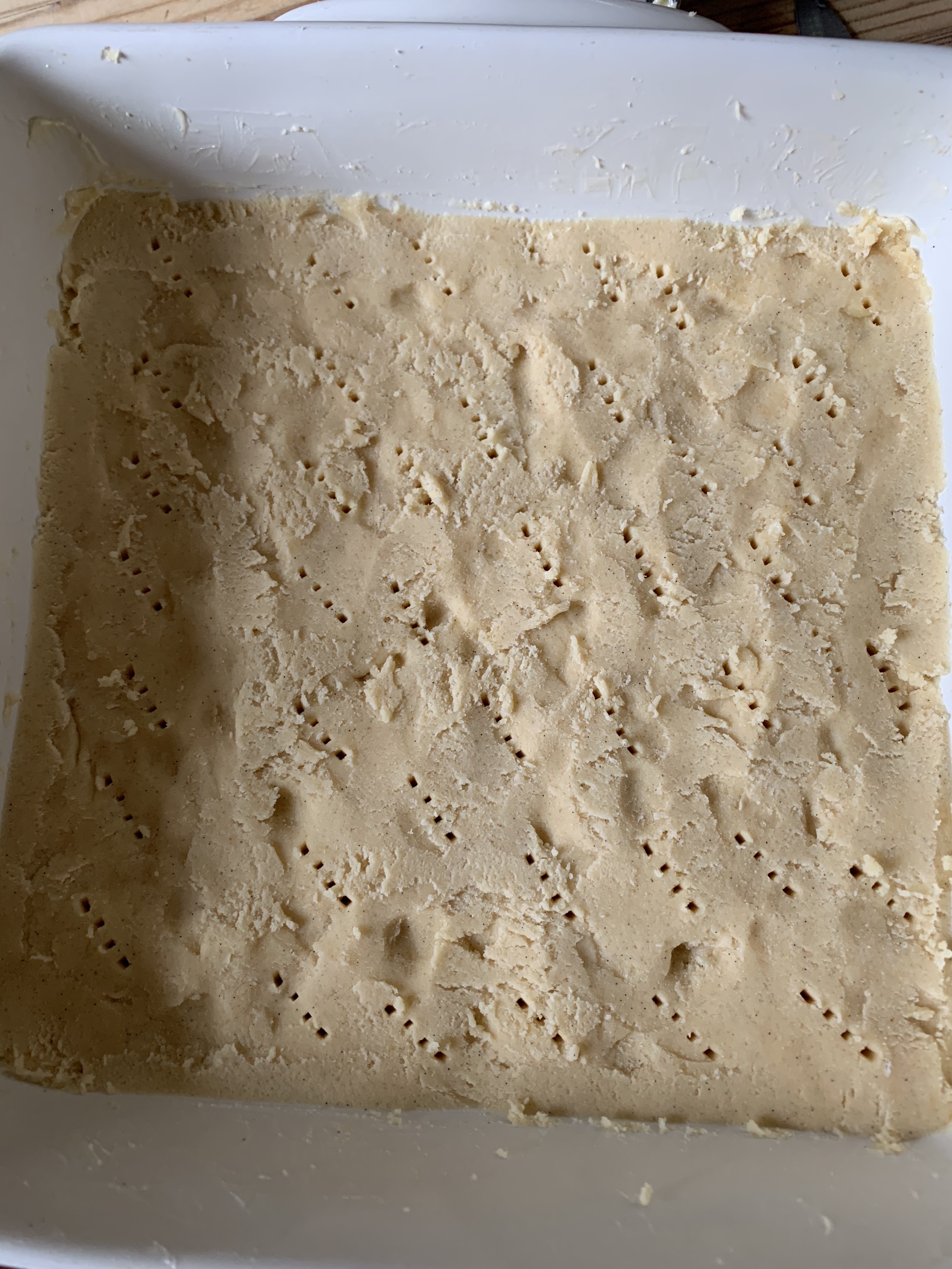 - Press the mixture into a 9×9 square tin or dish and prick all over with a fork. Grease the tin/dish well.