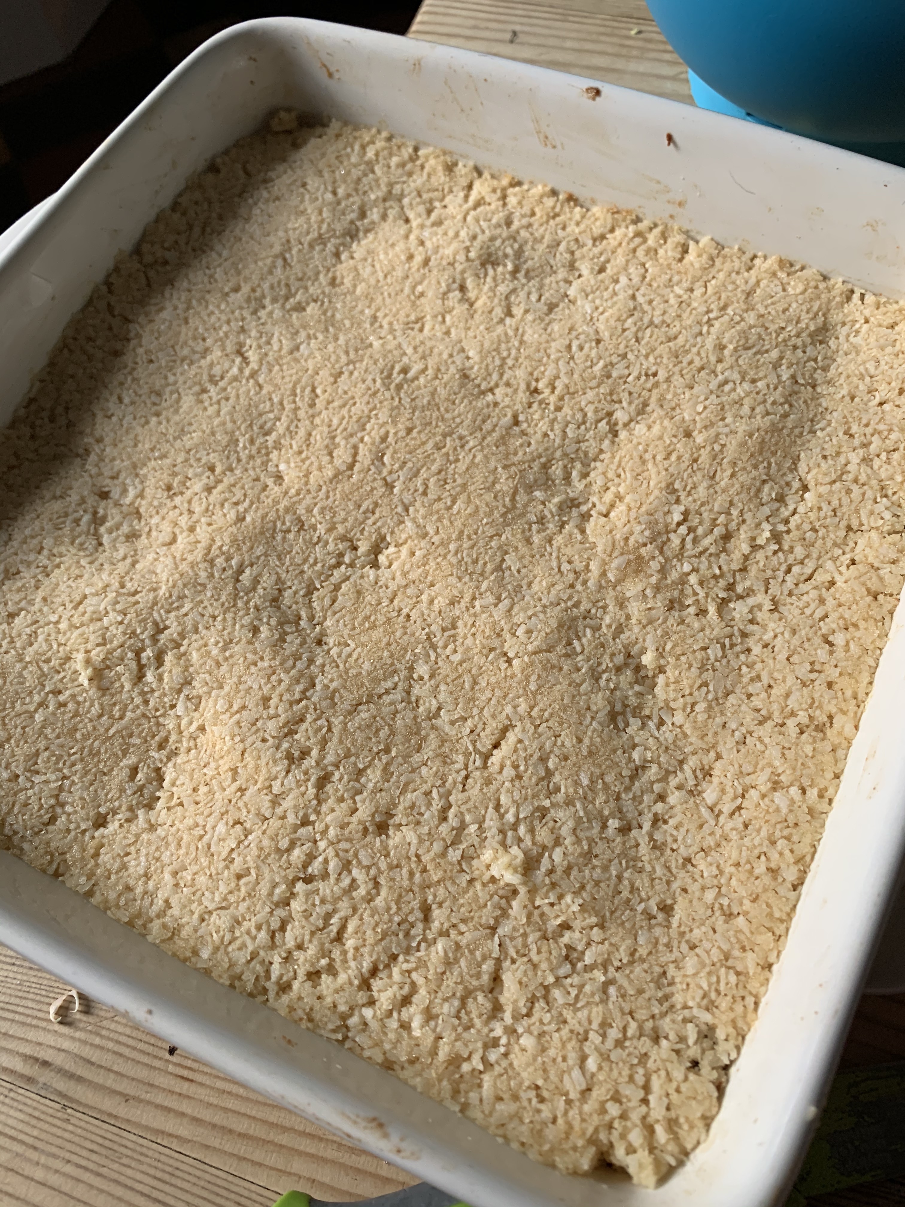 - Bake on 350F/177C/157C fan-assisted oven for 25-30 minutes until coconut topping is lightly browned.