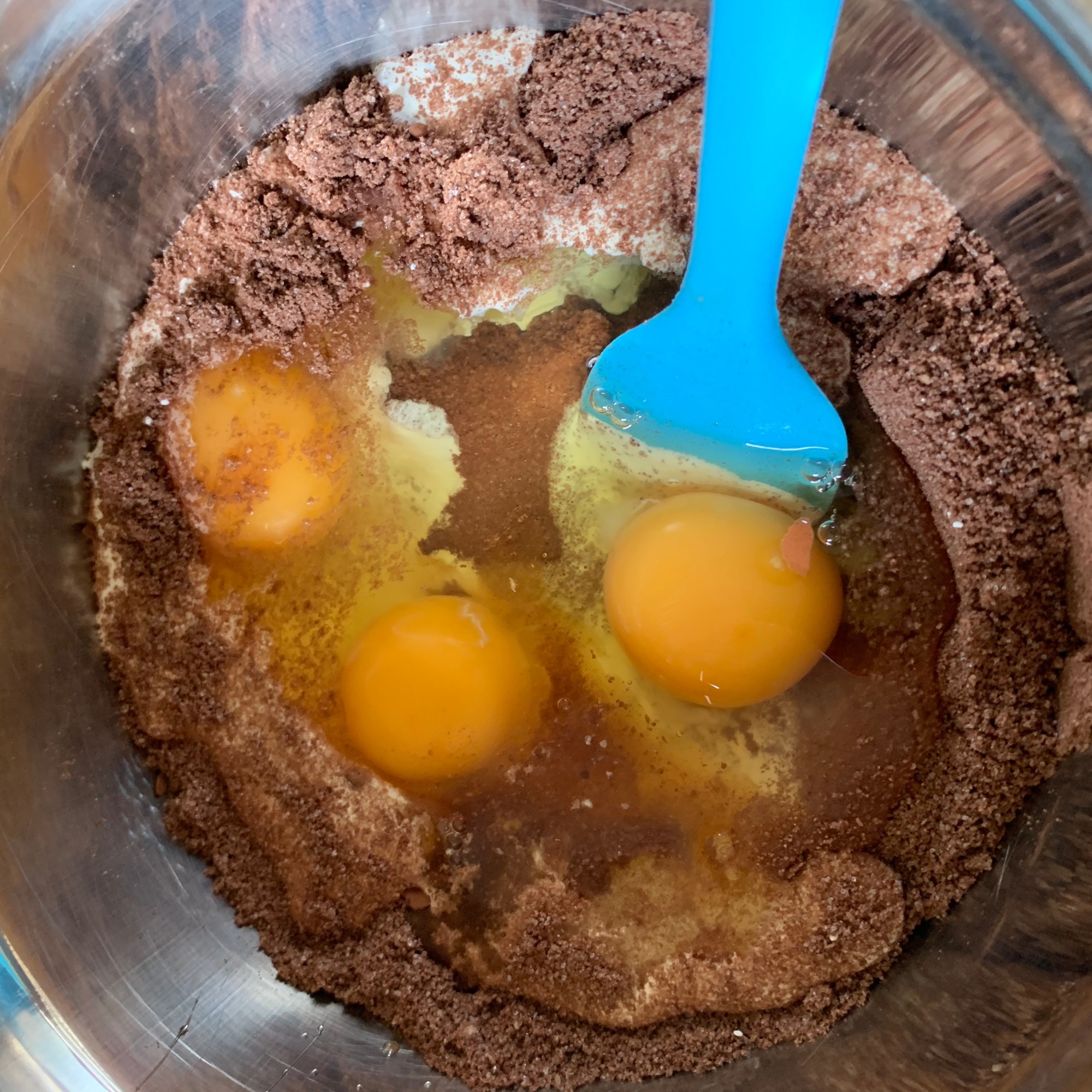- Whisk in the eggs and vanilla; then gently whisk in the dry ingredients just until mixed through. Don’t over-mix the batter or it will be less fudgy!