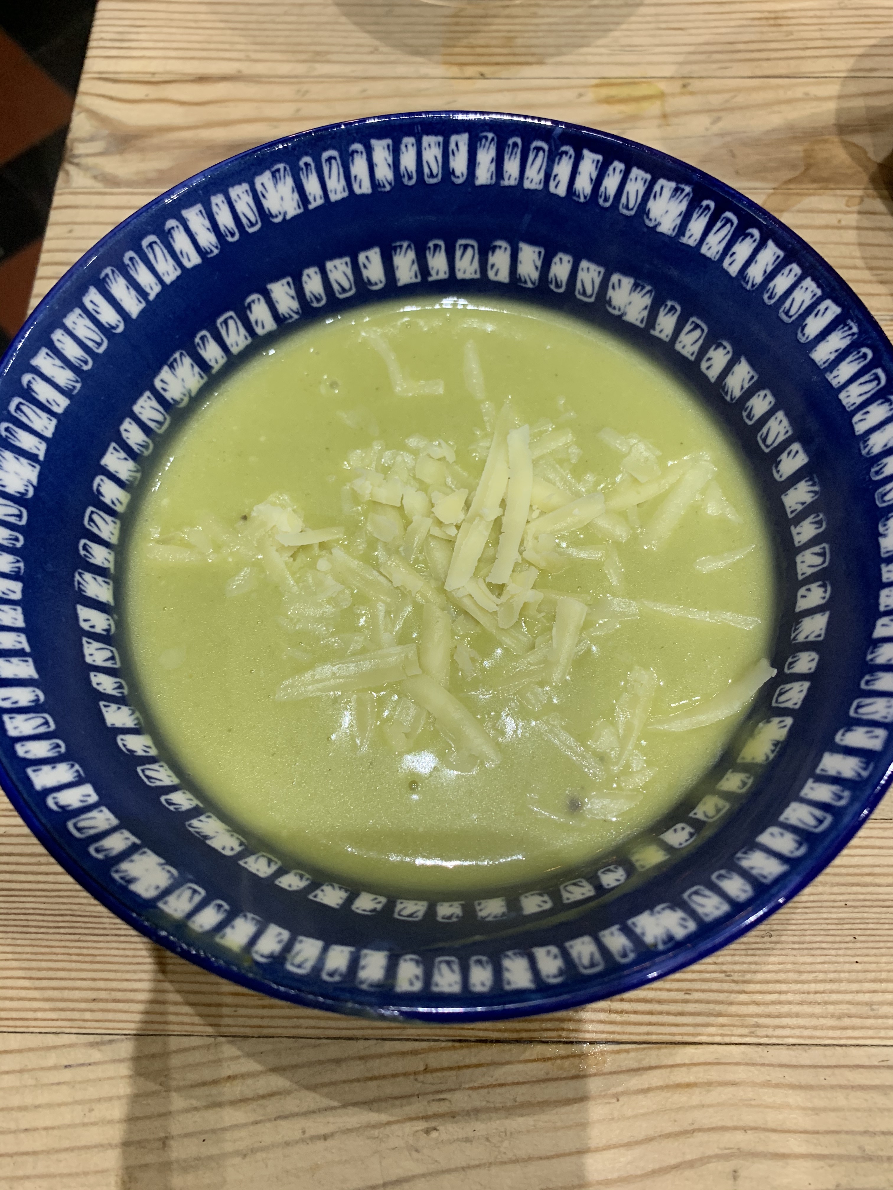 It’s cold, wet and windy here. Last night I needed comfort food and didn’t want a complex recipe. I love cheesed broccoli so this recipe felt right – five ingredients. Having read the original recipe, I decided to keep my interpretation of the recipe simple. We had a bag of large broccoli florets in the freezer which needed using up. I decided to use vegetable stock and plant-based double cream. I’m lactose intolerant so always use lactose-free cheddar cheese. My philosophy with soup is put the main ingredients in the pan, bring to the boil then simmer for the allocated time; 15 minutes worked well. At this point, I liquidised the soup in the Ninja processor as it’s far more efficient than an immersion blender (our immersion blender blew up and we never replaced it). I like broccoli but not enough to have florets of it floating in my soup! Cheese soup should be smooth.