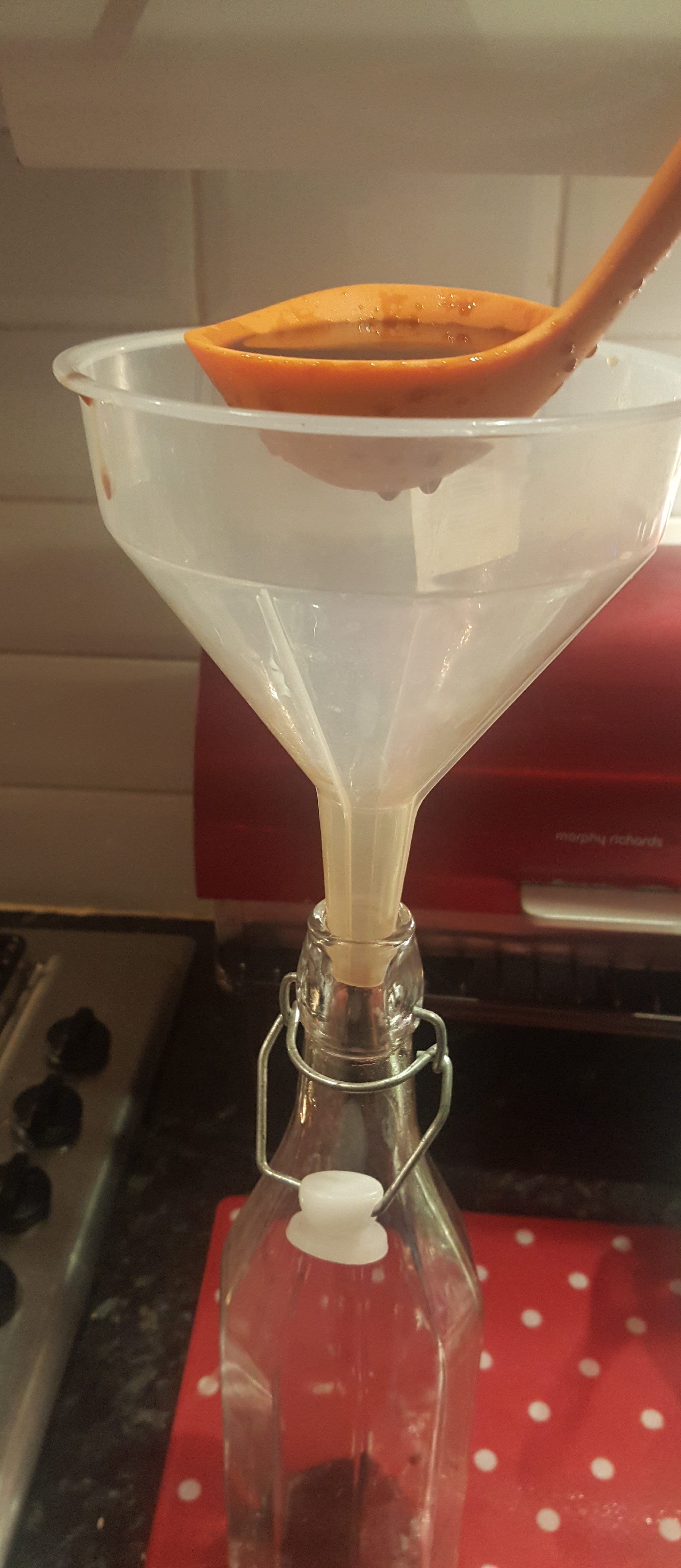Strain the mixture through a fine mesh sieve. Then strain again through a coffee filter (this will take several day and changes of coffee filter, but it’s worth it to get all the coffee “silt” out of the mixture.