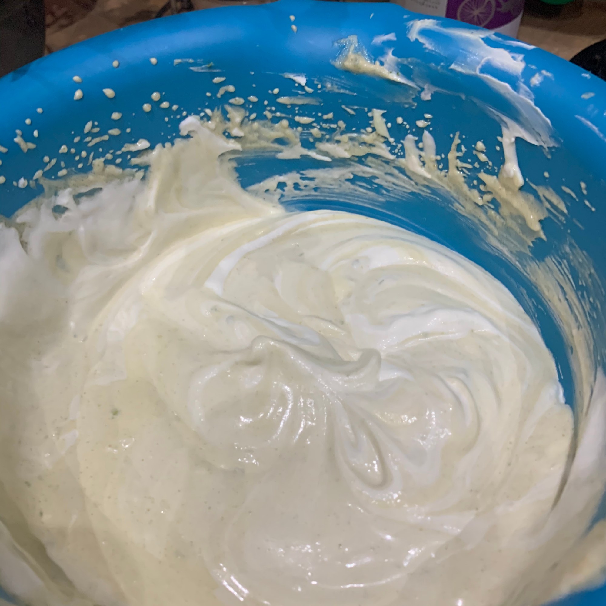 - In a bowl whip the sour cream (I used a plant-based double cream instead), then set aside.