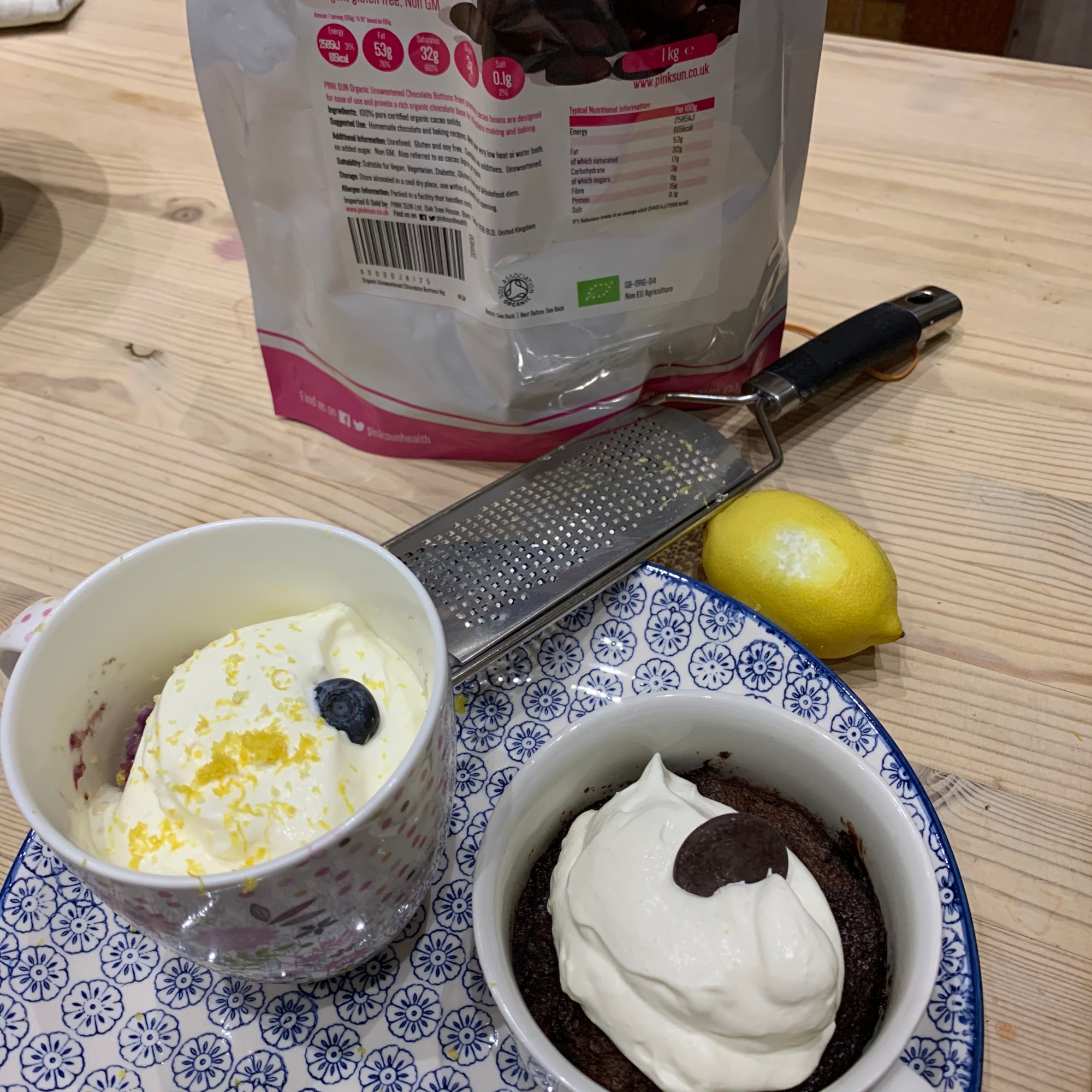 The chocolate mug cake is definitely a single portion but it is a rich flavour and an excellent texture. Just follow the cooking instructions, if its too moist on top, keep microwaving in single bursts of 3-5 seconds until you are happy with it. Let it cool a bit before adding whipped cream and grated chocolate. I stuck an unsweetened chocolate button in the cream.