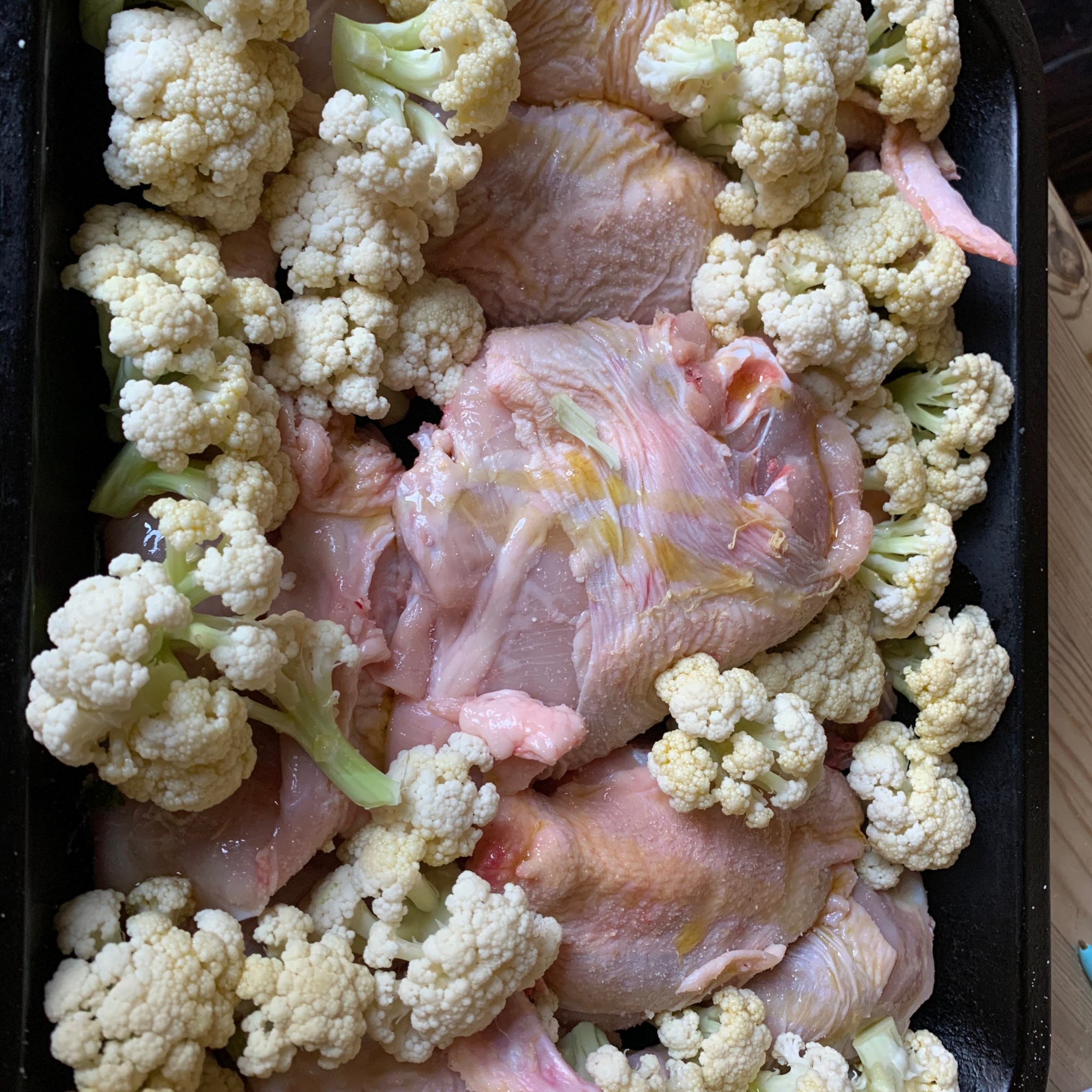 - Place the cauliflower and chicken, skin side up, in a deep roasting tray and toss with 1.5 tbsp of olive oil and a pinch of salt. Cook for around 30 minutes.