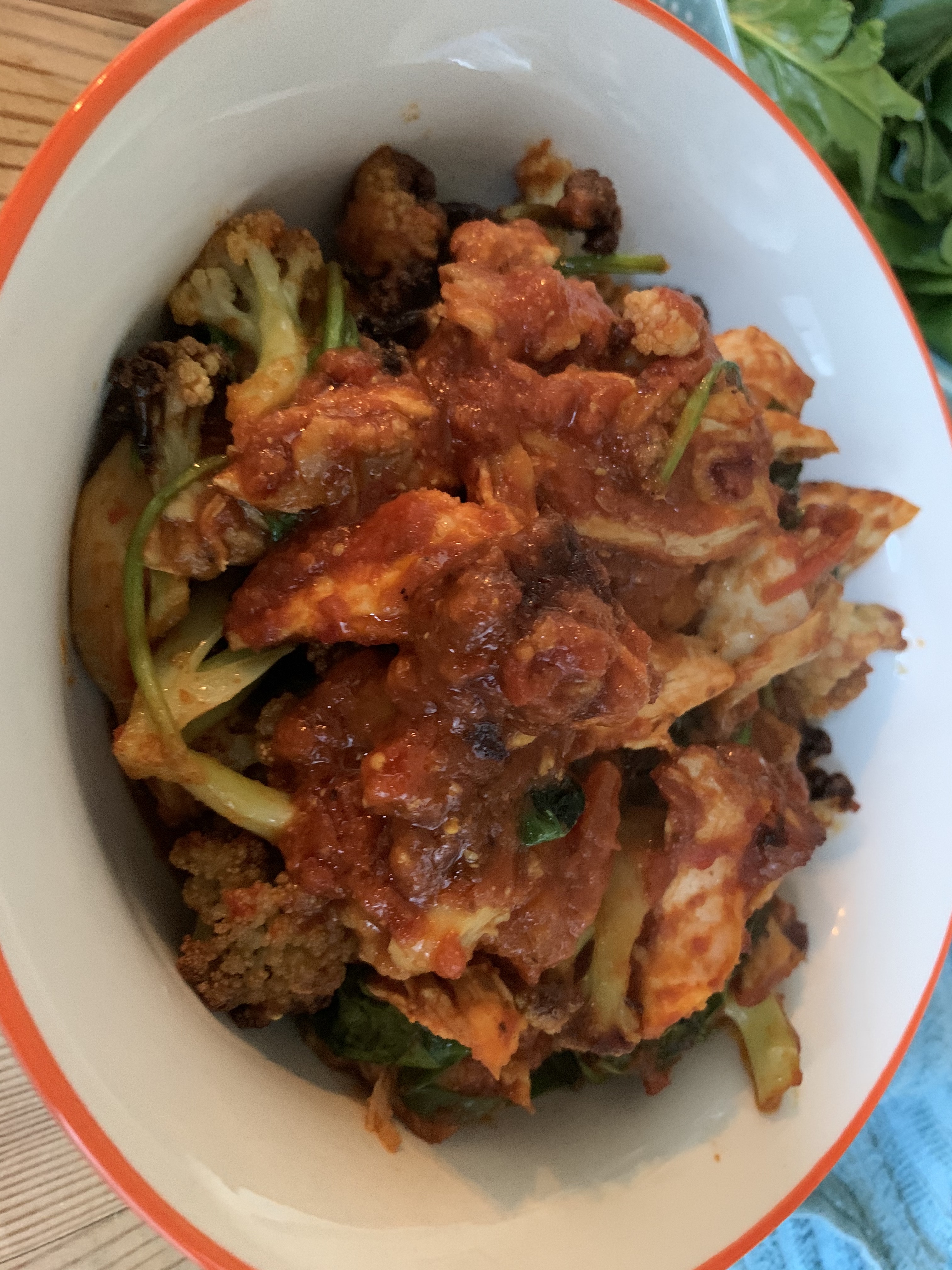We were going to roast a free range chicken but then I saw this recipe. What attracted me was the paste and it was delicious. The use of cauliflower was good. However, I followed all the instructions but found some of it browned a bit much. It didn’t affect the taste and the whole dish was delicious. The curry is nice on its own with some fresh spinach leaves or with steamed cauliflower rice. I will be making this again but with chicken fillets as it was a bit messy taking the chicken off the bone, shredding it and mixing it into the curry. It is worth making but I like keeping it simple. Try it and enjoy!