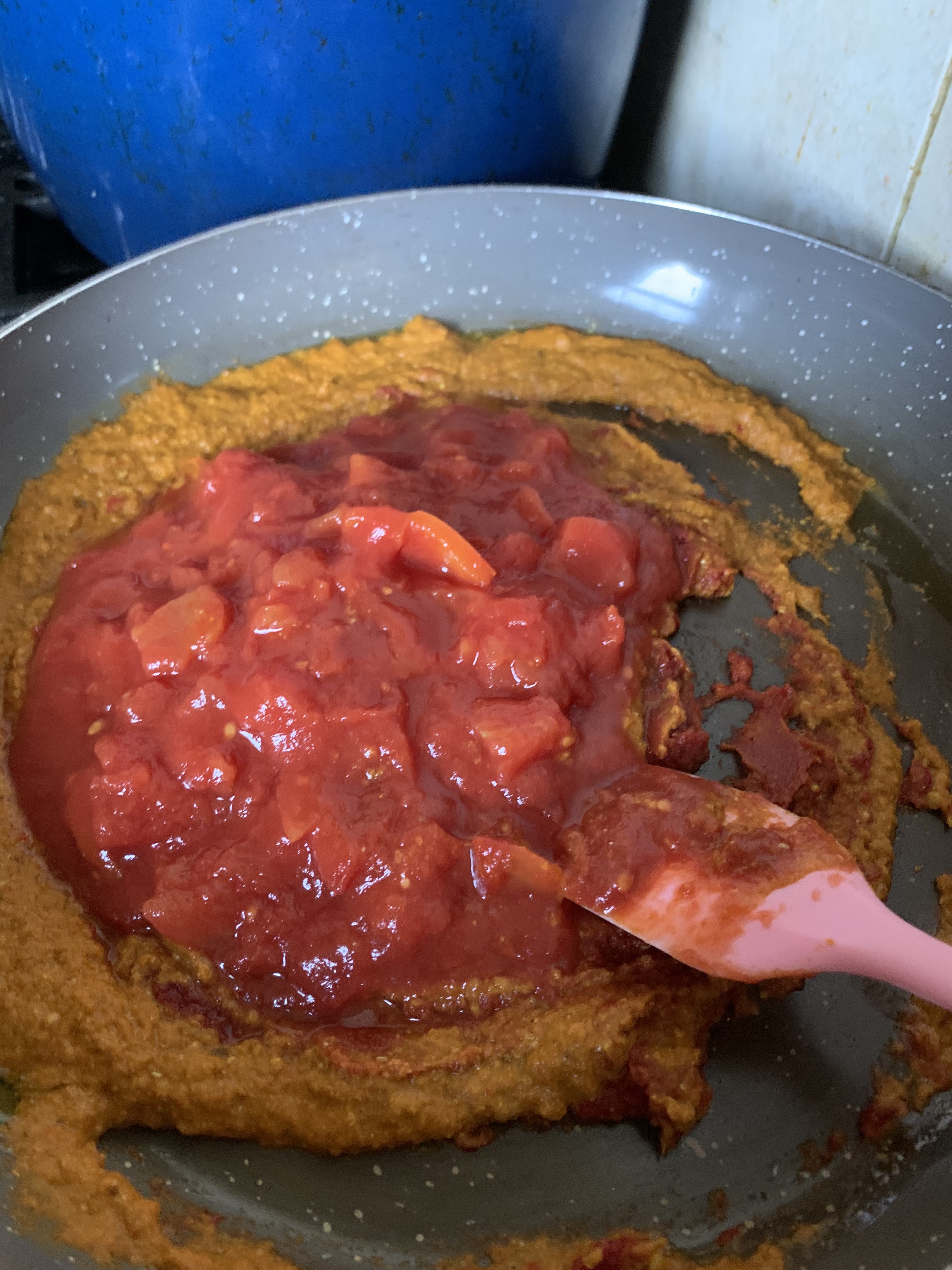 - To the paste, add the tomato paste, chopped tomatoes, chicken stock, 1/4 tsp salt, and pumpkin puree if using (I chose not to include pumpkin puree). Mix until all ingredients are incorporated and simmer for 5 minutes.