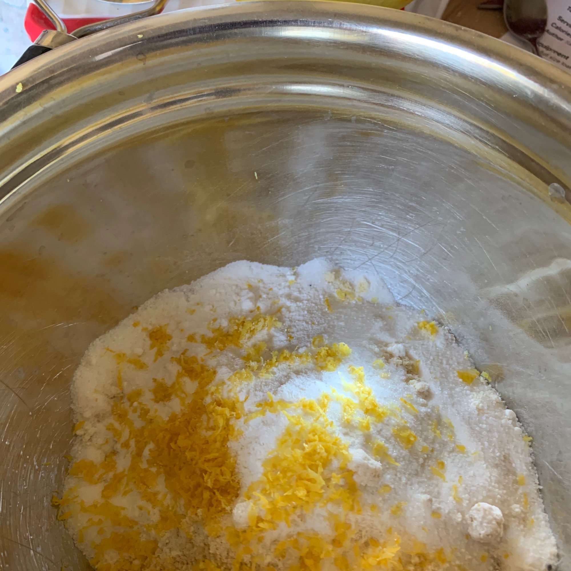 - Next, in a different bowl combine all the dry ingredients, stir until fully incorporated. Also add the lemon zest.