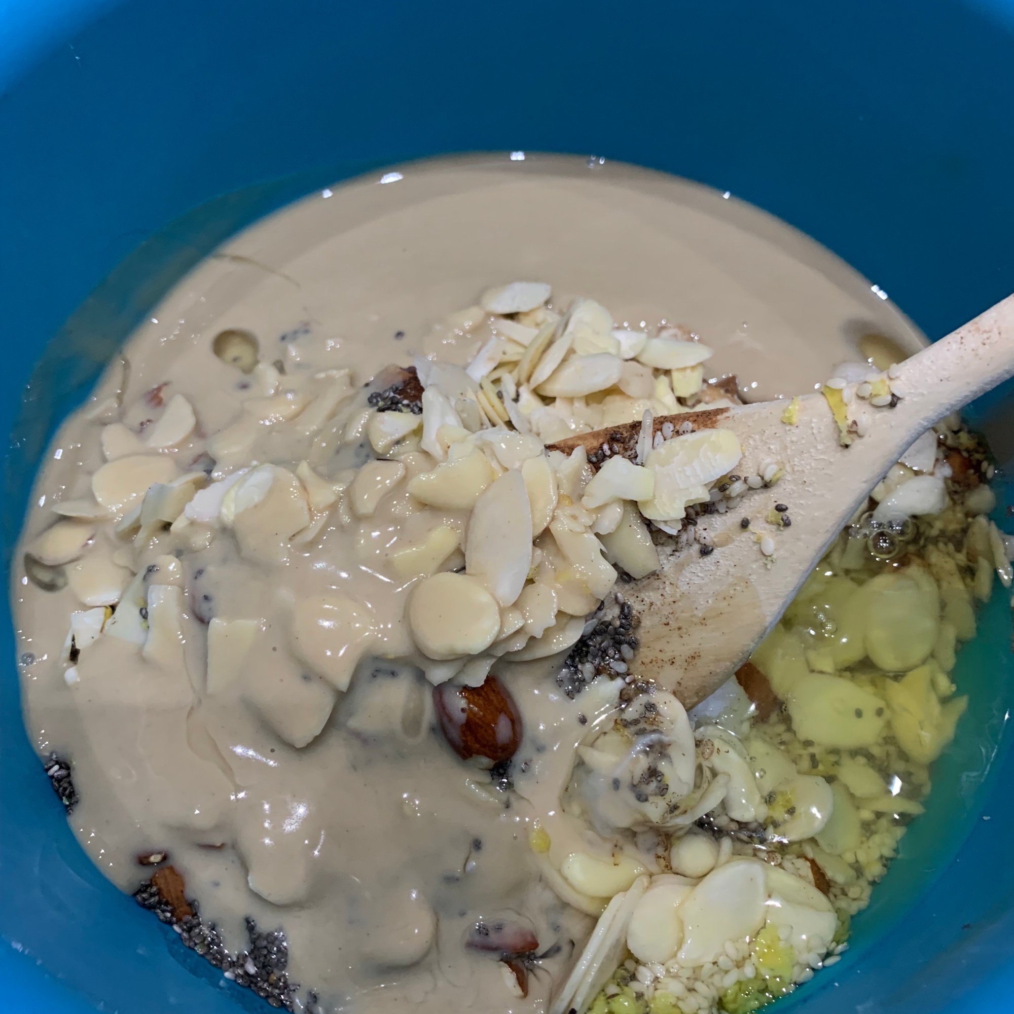 - In a smaller bowl, mix the tahini with the coconut oil. Then add to the dry ingredients, and mix to combine.
