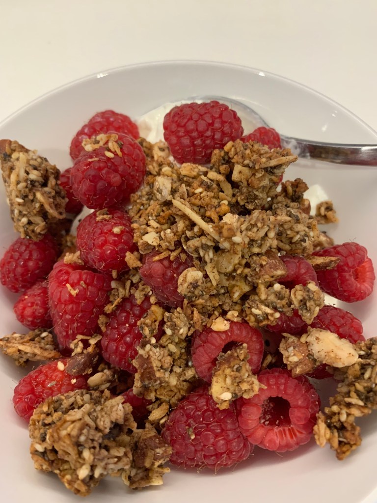 - Serve on its own, or with a milk, yoghurt or cream of your choice. I chose to serve mine with some raspberries and yoghurt.