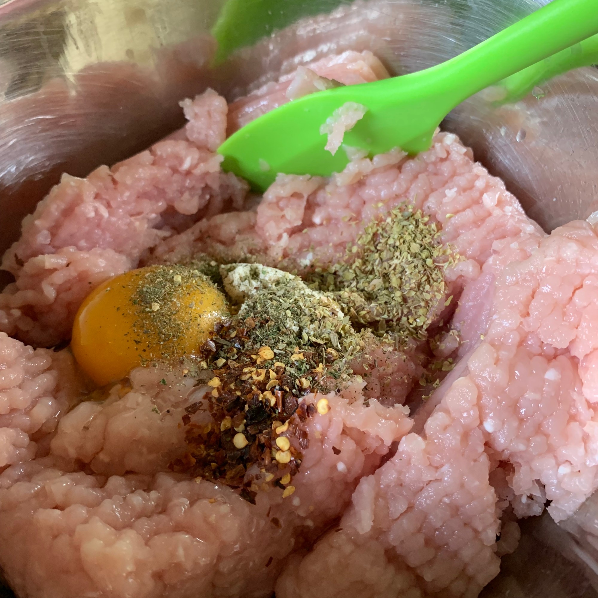 - Make the turkey meatballs by adding the ground turkey to a large bowl along with the onion and garlic powder, egg, parsley, oregano, pepper flakes, grated pecorino cheese, 1 teaspoon salt, a few cracks of pepper, and mix to combine. Make sure not to overmix as that will make the meatballs tough.