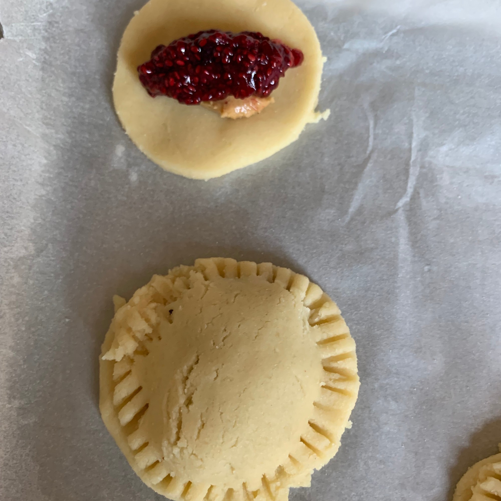 I had some flaky pastry leftover from the recent Keto Chicken pie recipe blog.The pastry had been in the fridge for 3 days so was easier to handle. I decided to make small hand pies with it using chia berry jam and smooth peanut butter. That’s one of my favourite combinations. I used a 2.5 inch circular cutter. Each one had a teaspoon of peanut butter and a heaped teaspoon of chia seed berry jam in it. There was no bursting open of the pies. It made 8 hand pies and the pastry was soft and flaky. The cooking time was accurate and the pies were delicious. The recipe website gives three alternative flavours.