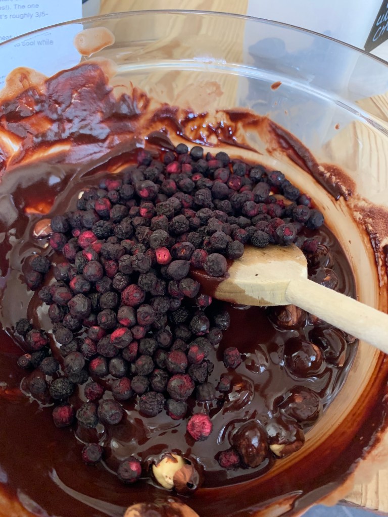 - Add the nuts, marshmallows and blueberries (if you choose to use them) into the chocolate and stir to coat. Press rocky road mix onto the prepared baking dish, cover and refrigerate until set.