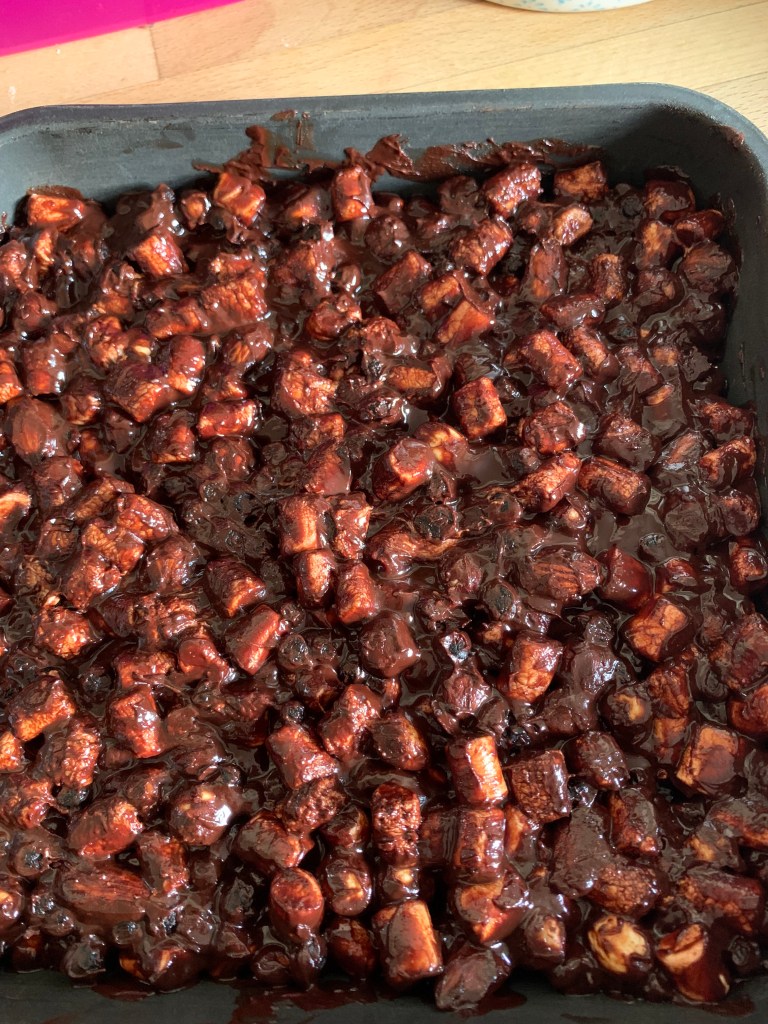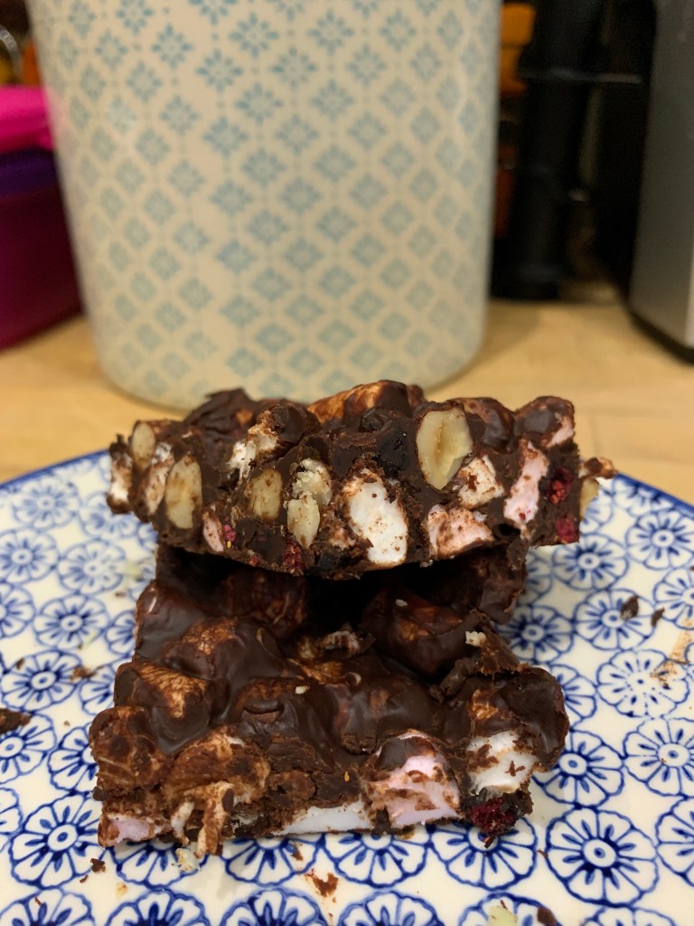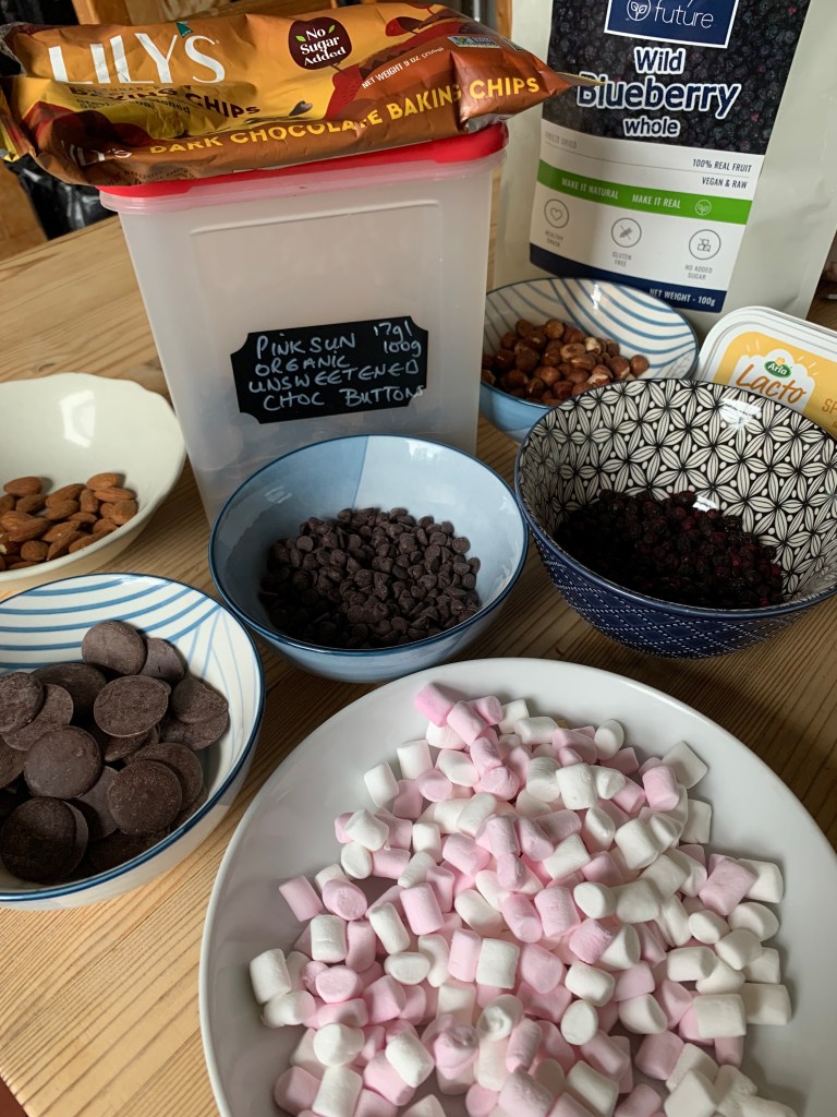 I like Rocky Road but not the full-of-sugar variety. This recipe has healthy fats from the nuts and 2.5 net carbs per serving. I would recommend using the freeze dried blueberries as they add a sharpness and texture to the Rocky Road. This is an easy recipe. Just take care to melt the chocolate and butter over a pan of hot water slowly and stir continually. I carried on stirring off the heat as the chocolate cooled to room temperature. It took about 5/6 minutes to make once the ingredients were weighed out. Monitor the nuts while you toast them in a dry skillet as you don’t want them to burn. I used a mix of chocolate chips as the Lily’s brand is expensive here. The finished product has great texture and flavour. I’ve tried the finished product on a range of people and they all liked it and didn’t notice the absence of sugar or biscuit (cookie) pieces. This is a successful recipe. It makes 16 servings.