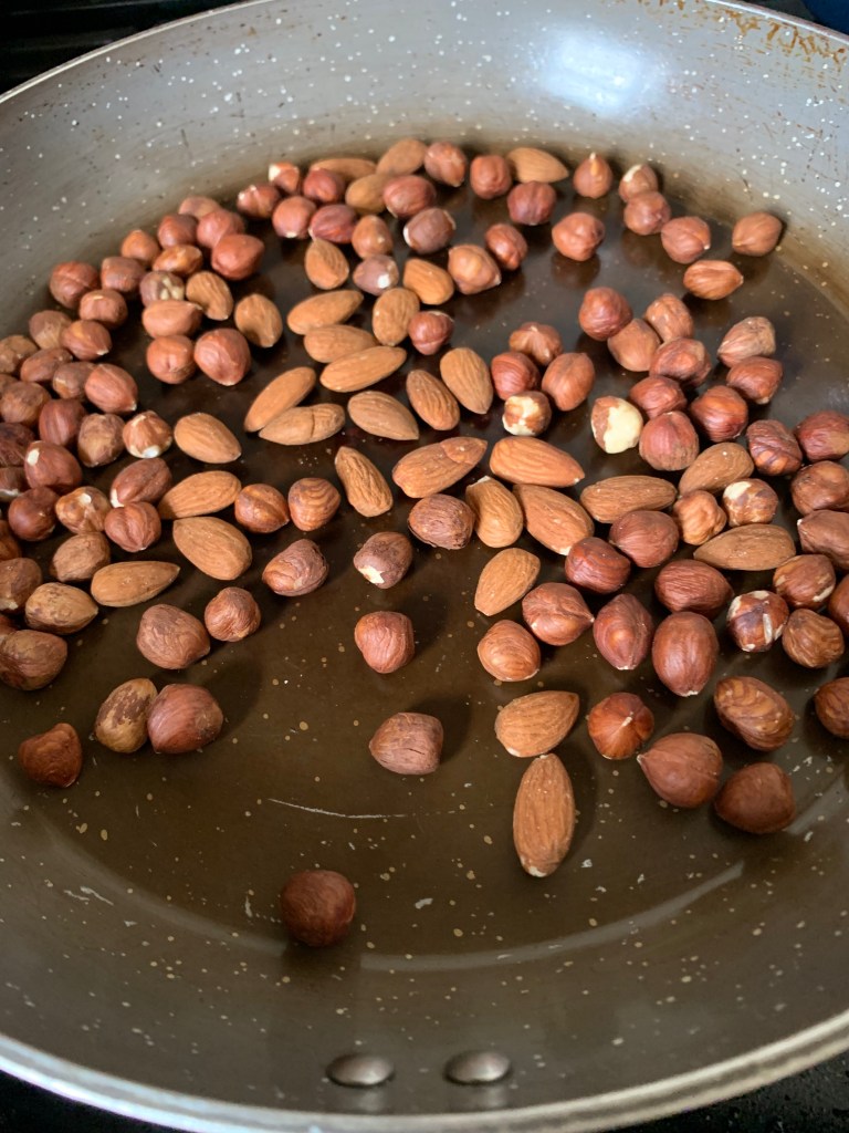 - Toast the hazelnuts and almonds in a dry skillet or pan over medium/low heat until golden and fragrant, tossing them about every so often (about 5 minutes). Set aside to cool while you prepare the rest.