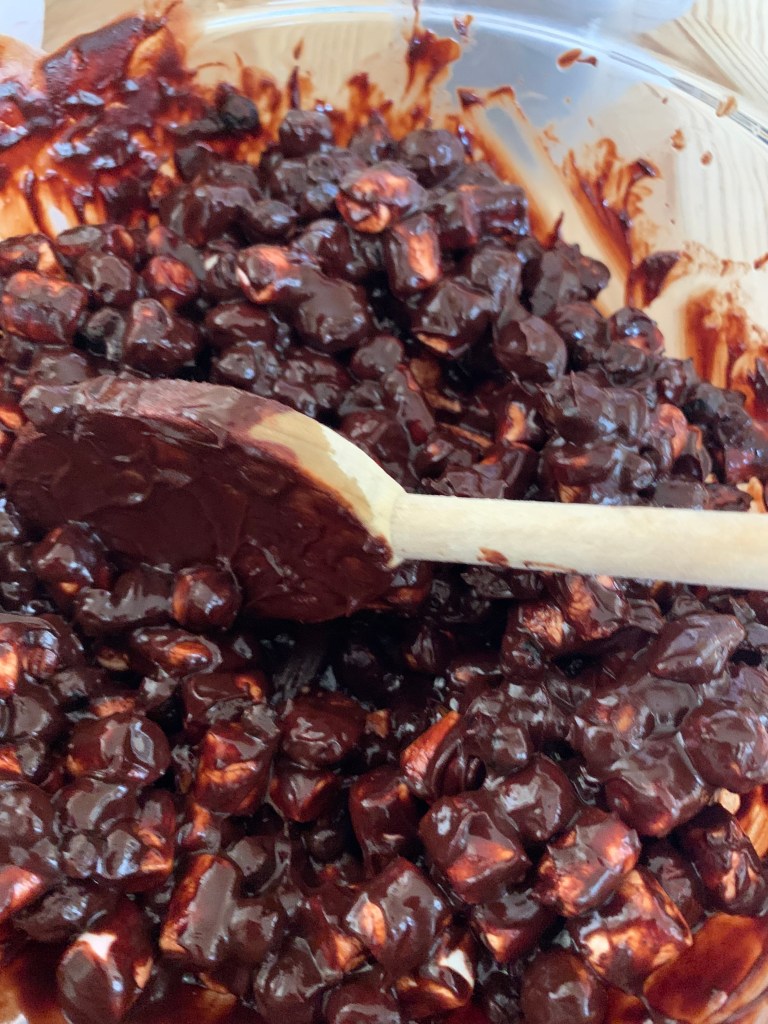 - Melt the chocolate chips and butter in a water bath, stirring constantly until smooth. Remove from heat and allow to come to room temperature (this is important as you don’t want the marshmallows to melt).