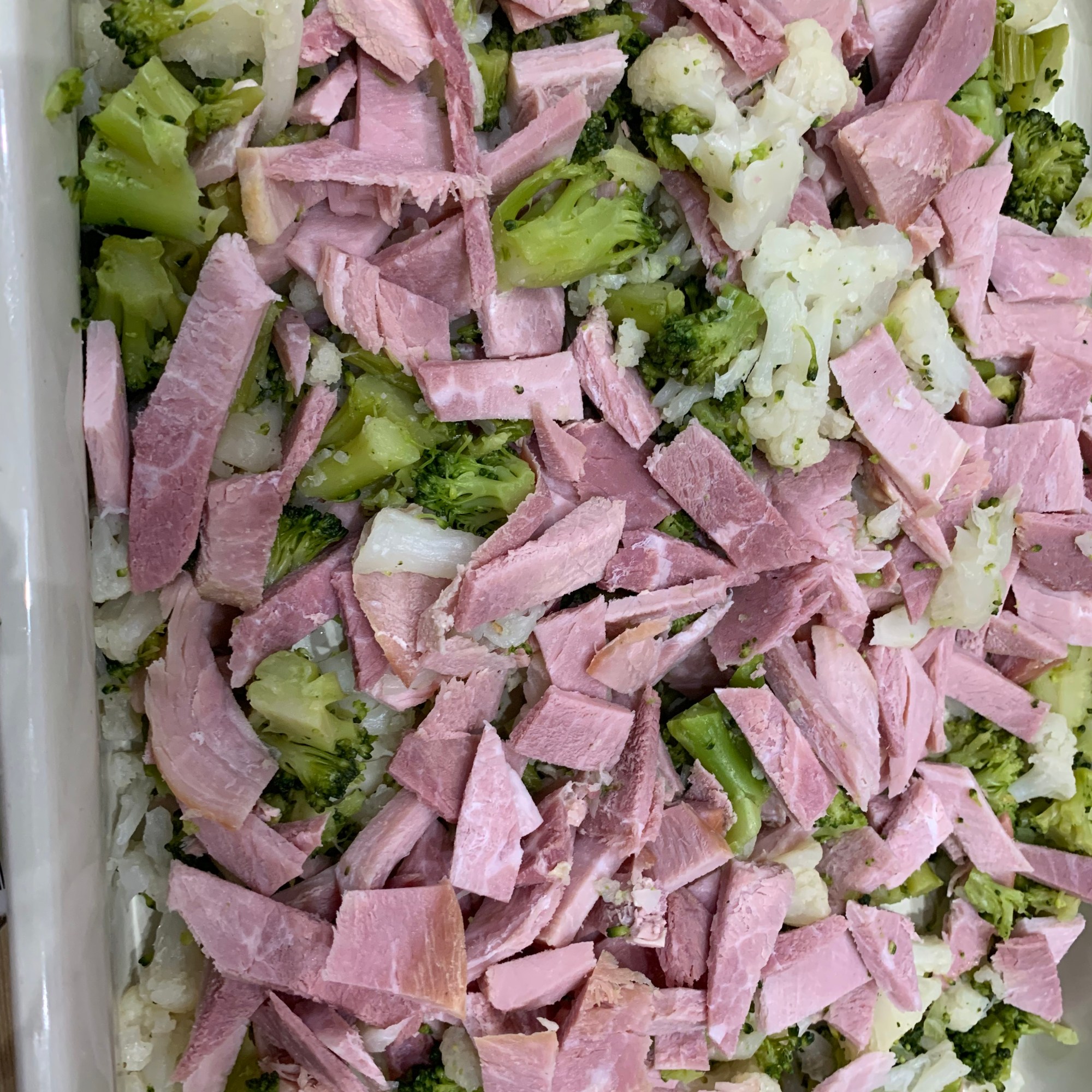 - Place the veg into an oven proof dish, and gently mix in the diced ham.