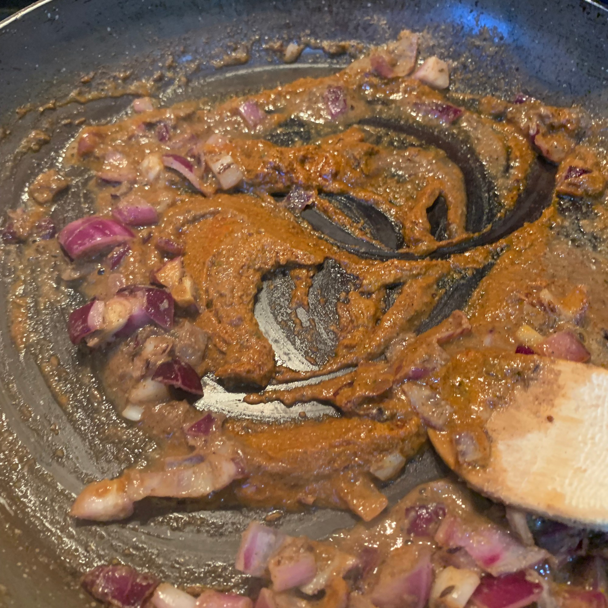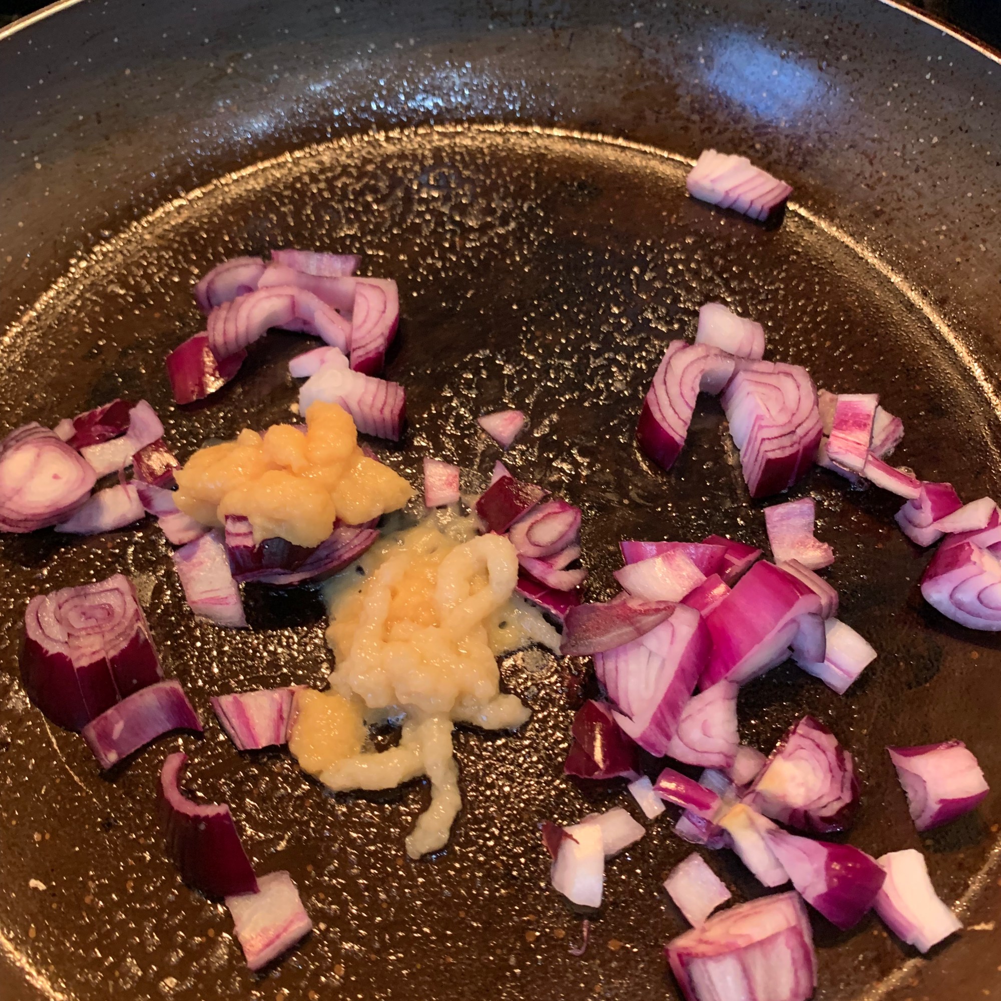- Next add the garlic, ginger and spices and fry for 1 more minute until fragrant. (I added tikka masala paste as a substitute for some of the spices).