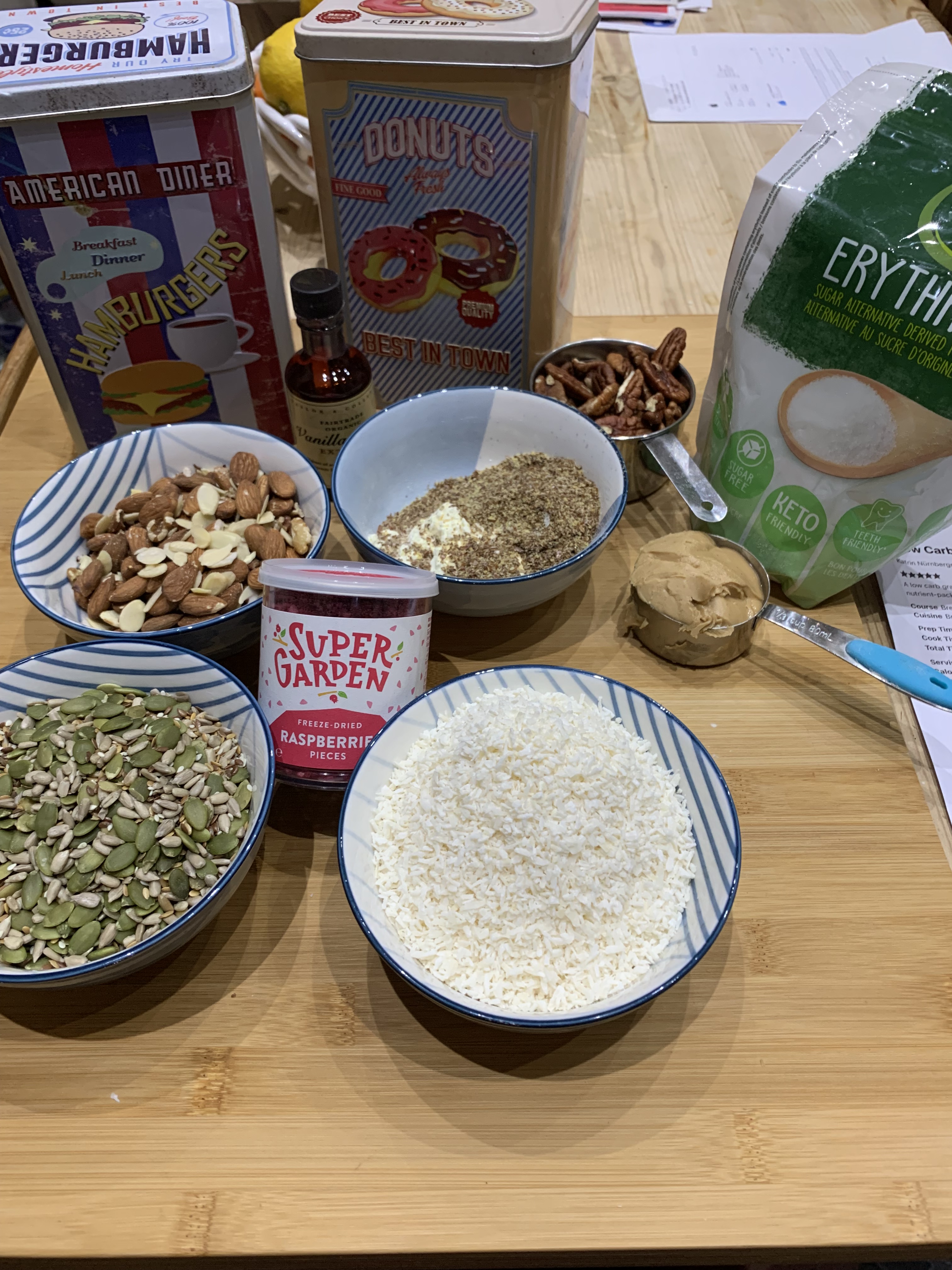 I enjoy low carb granola for breakfast with coconut milk greek style yogurt, blueberries and a splash of Skinny Maple Syrup. It keeps me full all morning. This recipe caught my eye as it has freeze dried raspberries in it which I thought would add extra zest to it. It’s an easy recipe as you use a blender to chop the nuts so you have a mix of smaller and ,larger pieces. it’s important that the final is sticky so that it comes toner. It crisps up when cooking. You need to monitor the cooking so that it’s evenly browned – mine took 30 minutes to brown evenly. It makes about a litre and a half of granola. The freeze dried raspberries lift the flavour to a higher level. It’s crunchy and the raspberries give it a zing of sharpness which is lovely. enjoy it for breakfast or a healthy snack during the day. At Net Carbs of 3.7g per 50g it is very satisfying. It’s an easy and accurate recipe. Try it and enjoy!