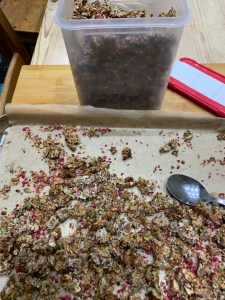 - Remove the granola from the oven and set aside.