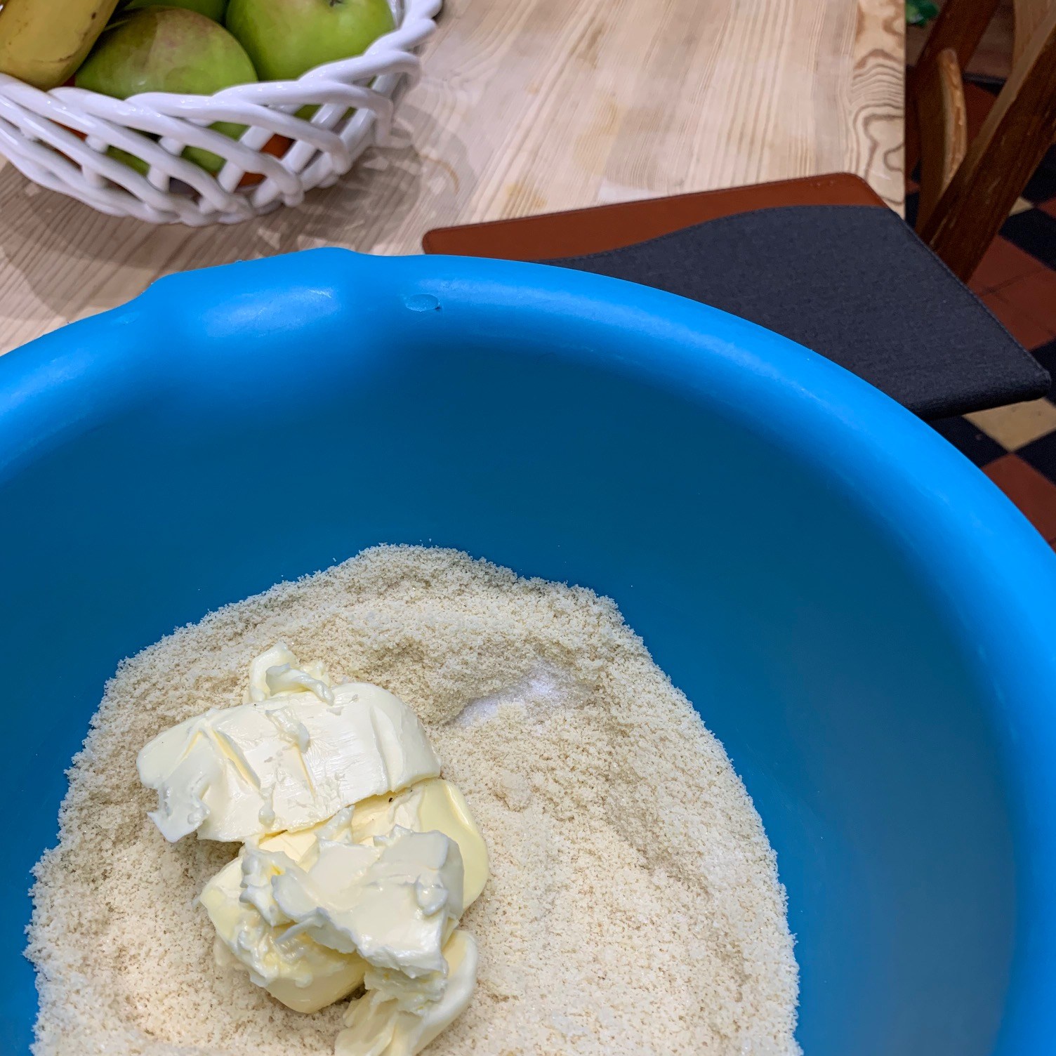 • Next, add the butter and rub into the dry ingredients, until well combined and crumbly in texture.