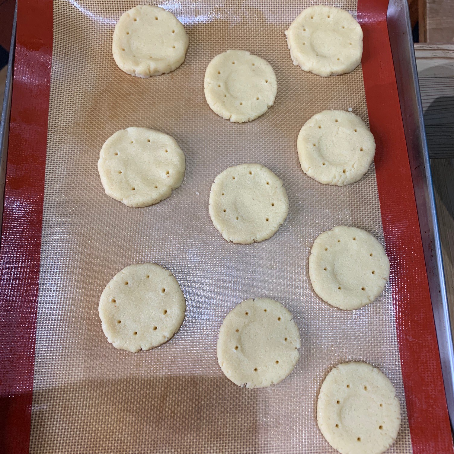 • Using a tablespoon sized amount, roll the shortbread mixture into balls, then press into discs onto the prepared baking tray.