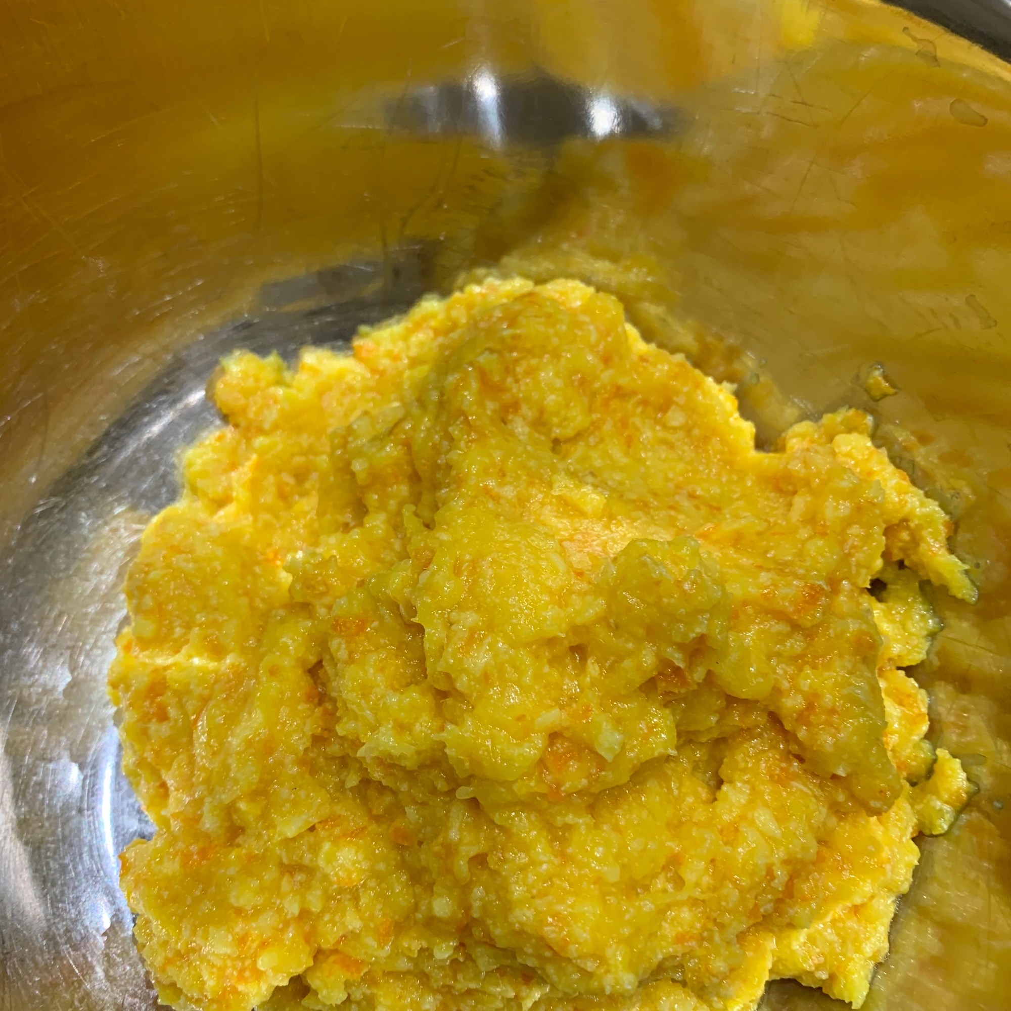 • To the orange pulp, add all the ingredients, minus the egg whites and mix.