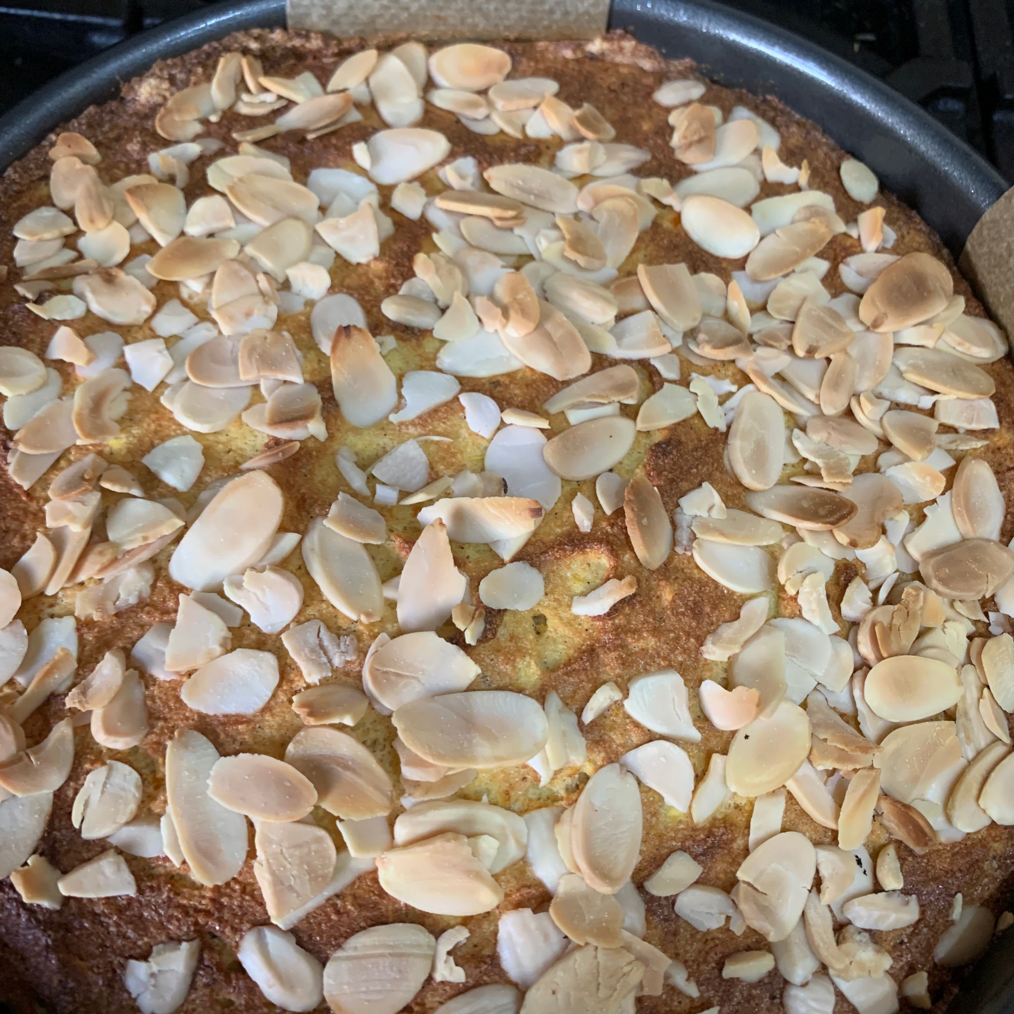 • Pour the batter into the prepared tin, and sprinkle the flaked almonds on top.