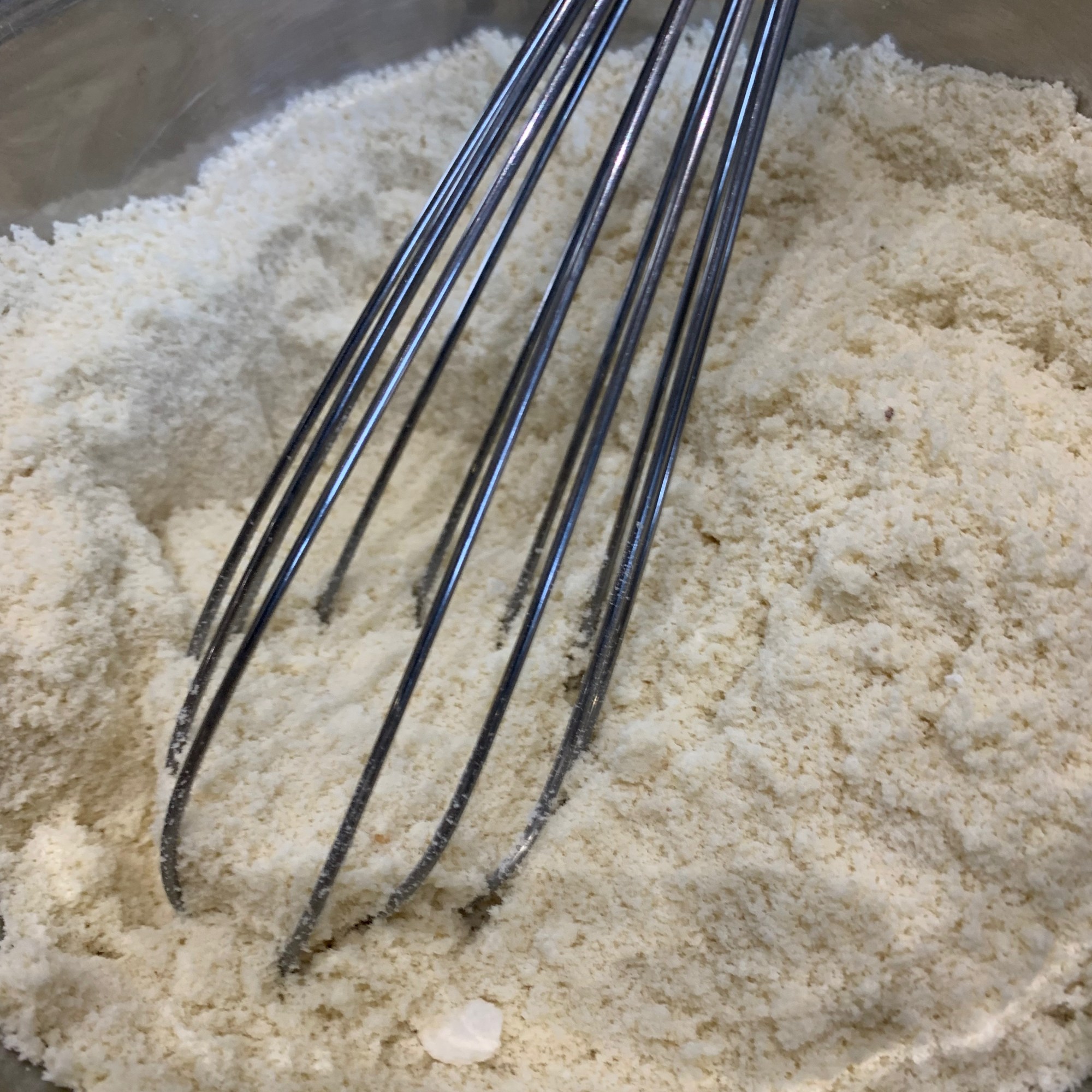 - In another bowl, mix together the almond flour, coconut flour, protein powder, baking powder, and salt.