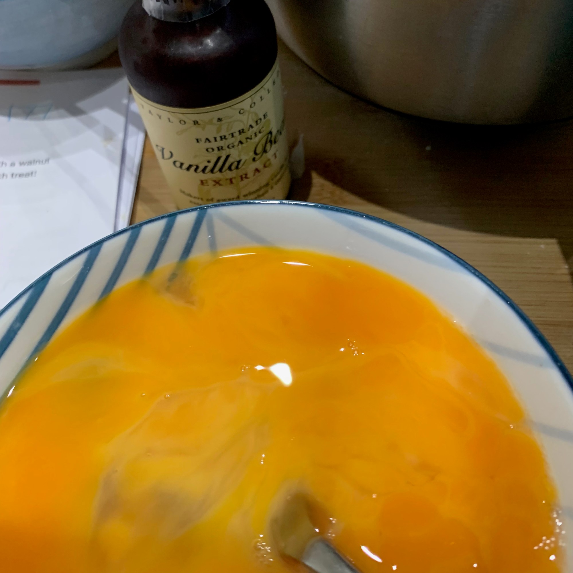 - Beat in the eggs one at a time, once this is done, add the vanilla extract and whisk until fully incorporated.