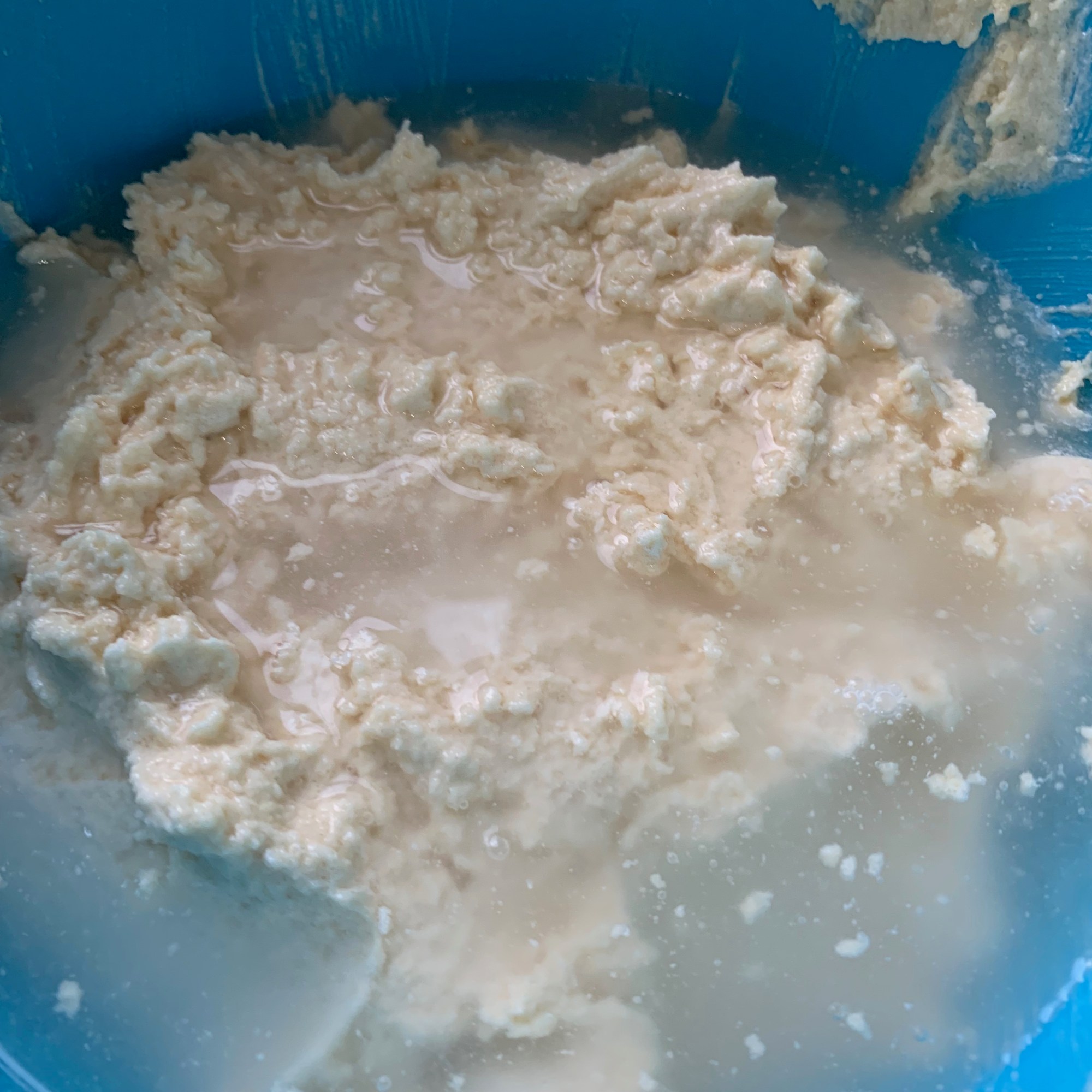 - Then whisk in ¾ cup of the water. If the batter is quite thick, add additional water as necessary. The batter should scoopable and spreadable but not quite pourable.