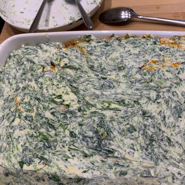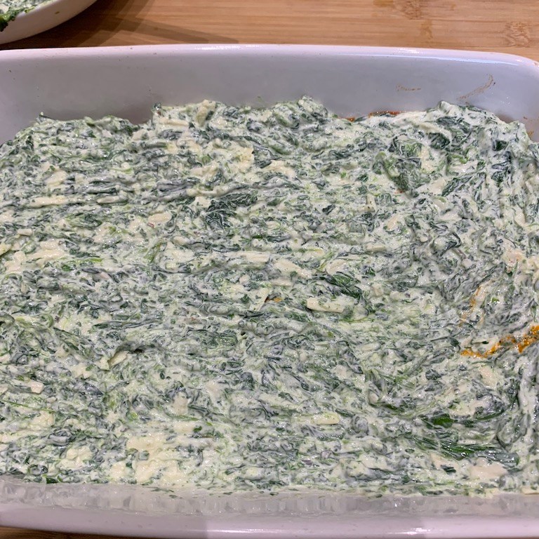 - Make up the cream cheese and spinach layer by mixing it together. I added a little unsweetened coconut milk to help the mixture and then half a cup of the grated cheddar. Check flavour and add seasoning to taste. It could be a little nutmeg, garlic salt or Italian herbs. I used basil.