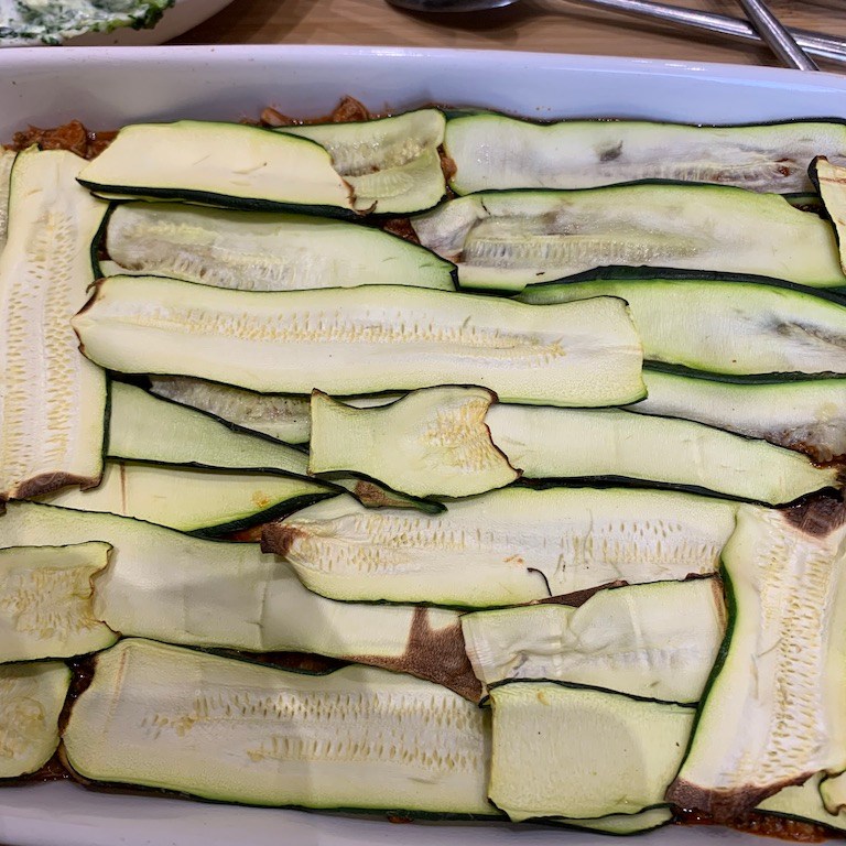 - Prepare the baking dish with a little olive oil. start to layer ups the lasagne. First layer was half of the sausage meat mixture, then half of the courgettes, then cheese and spinach topped by the sausage mix. Layer the rest of the courgettes topped by the cheese and spinach layer. Sprinkle the remaining cheese over.