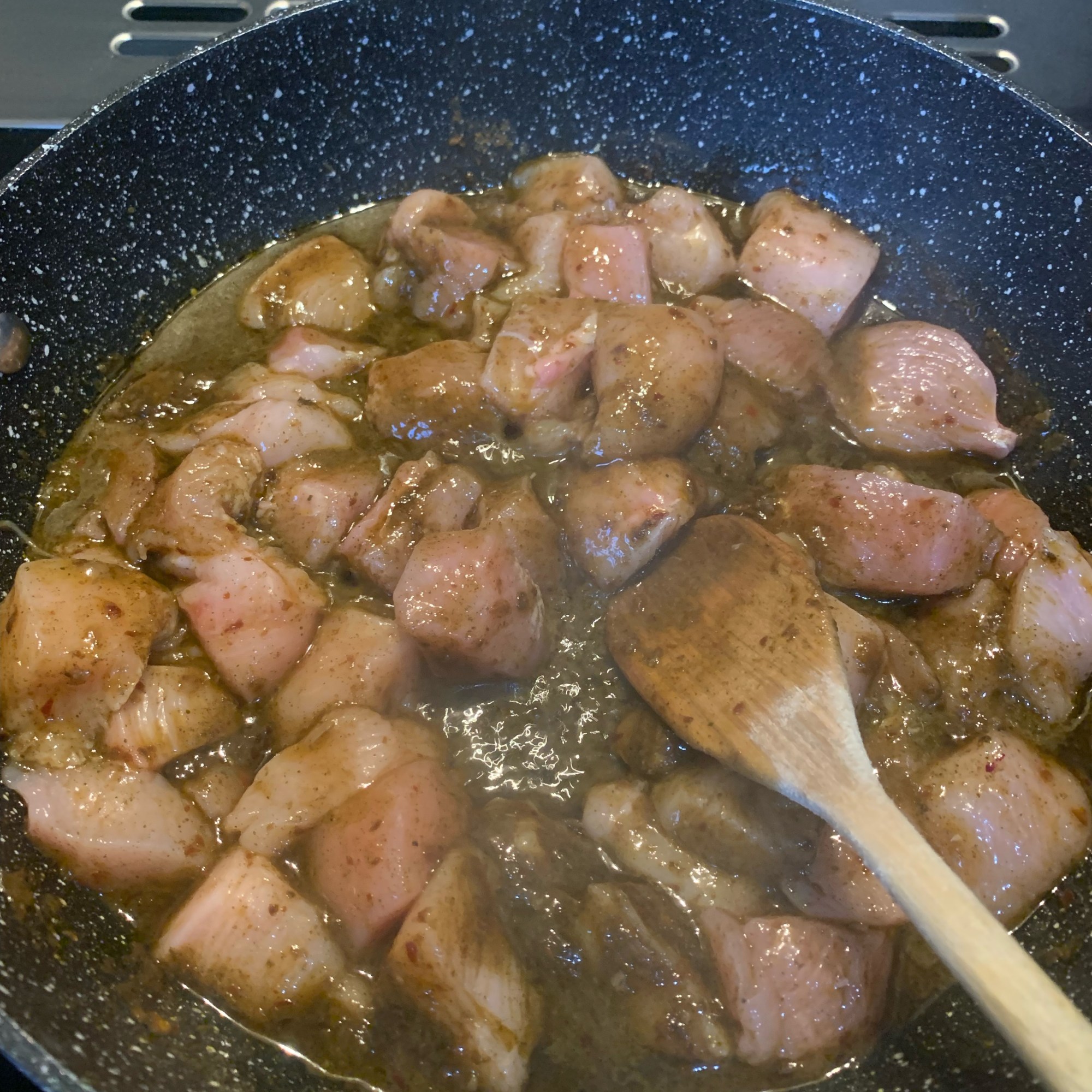 - Next, add the chicken, mix well and brown for 3-5 minutes.