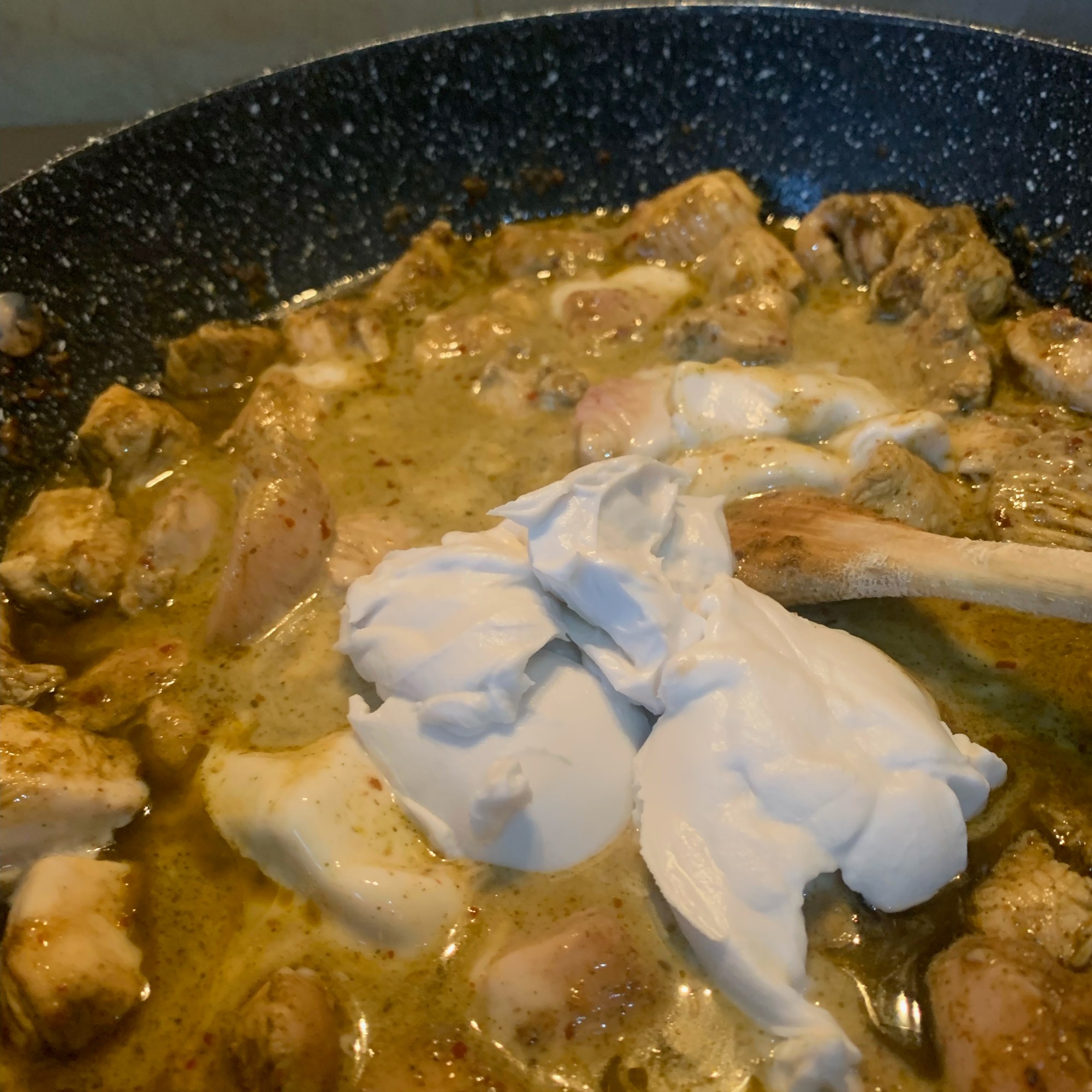 - Once the chicken is browned, add the coconut milk and fish sauce (if using).