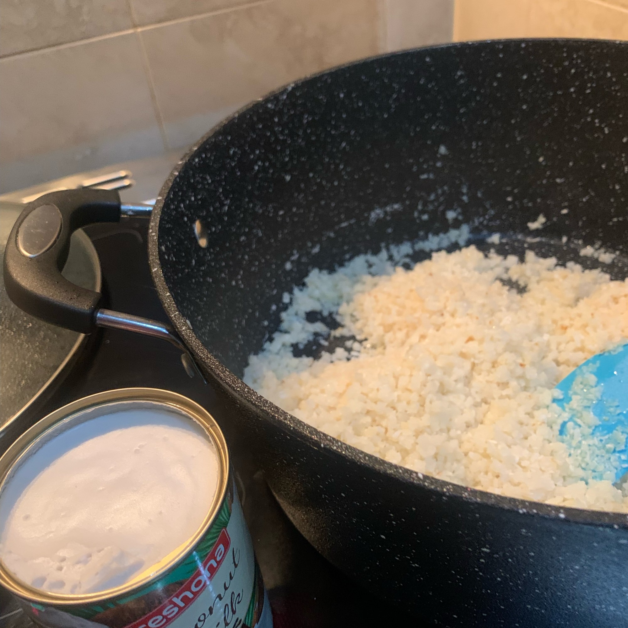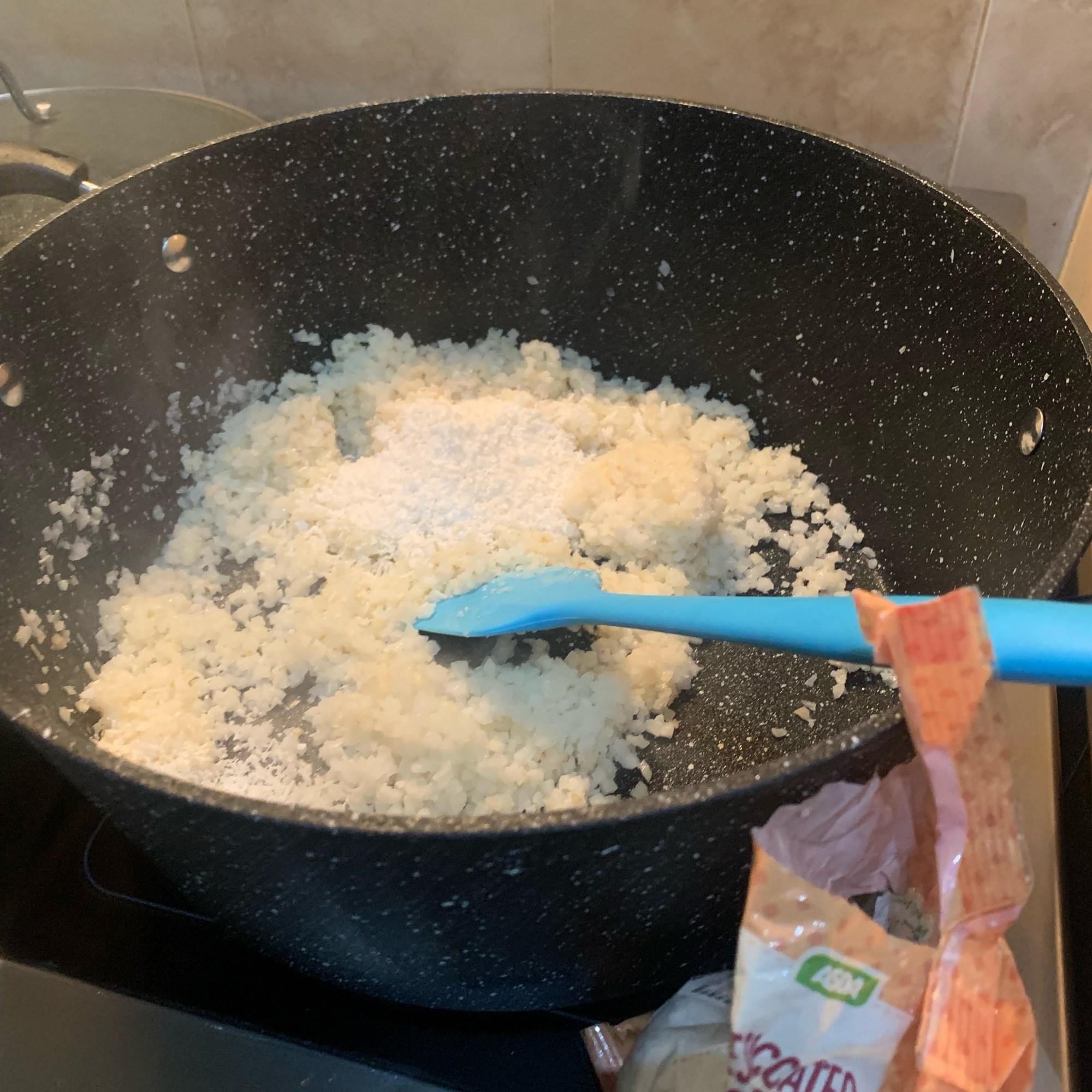 - Add the cauliflower rice, and cook for around 5 minutes, stirring occasionally.