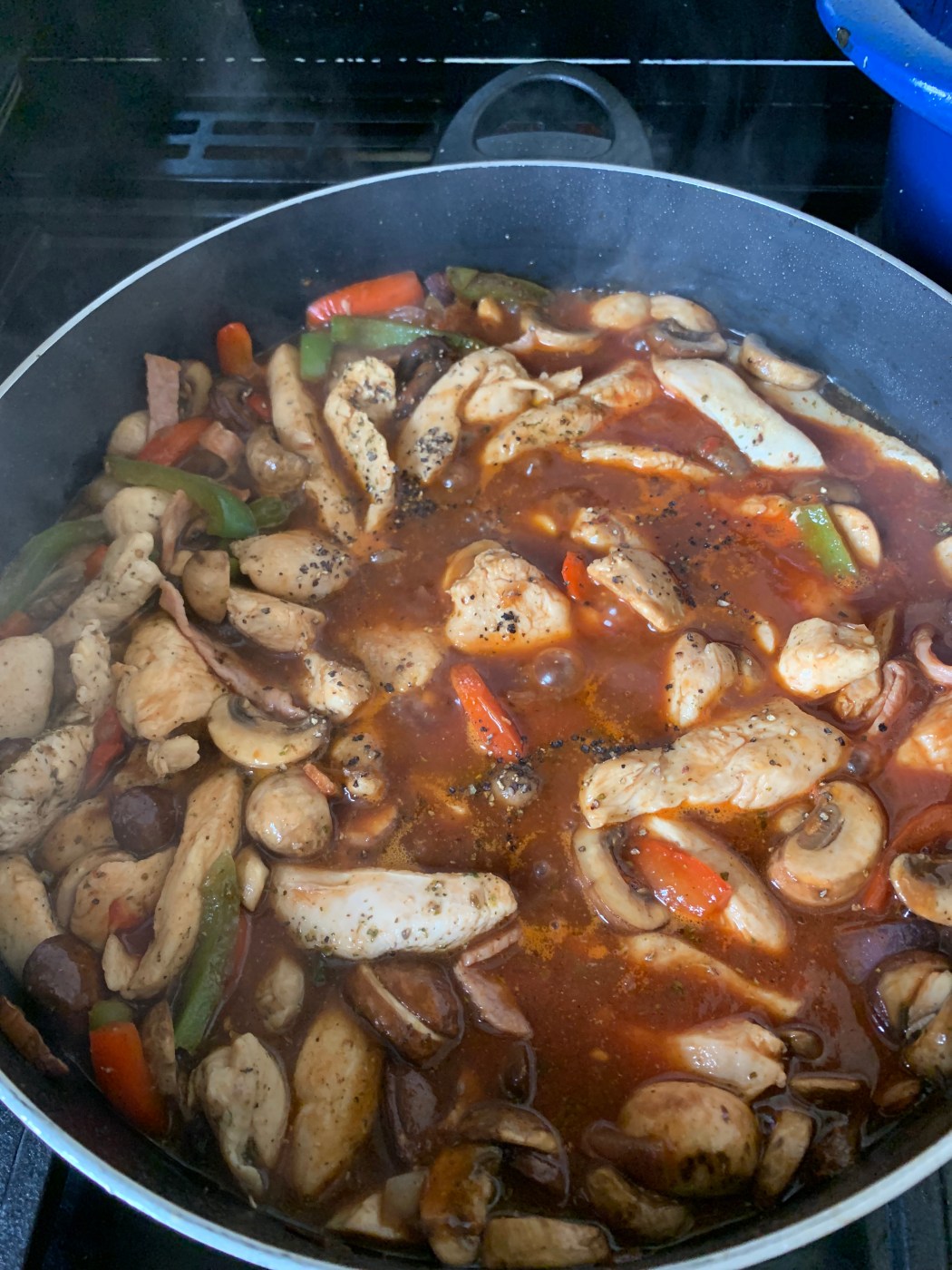l wanted something different and came across this recipe. It was for a family lunch in the garden served with vegetables, cauliflower rice, salad and steamed new potatoes for those that eat carbs. I simplified the method a bit as it appeared over-complicated. Instead of cornflour, I used tomato puree to thicken as cacciatore is…